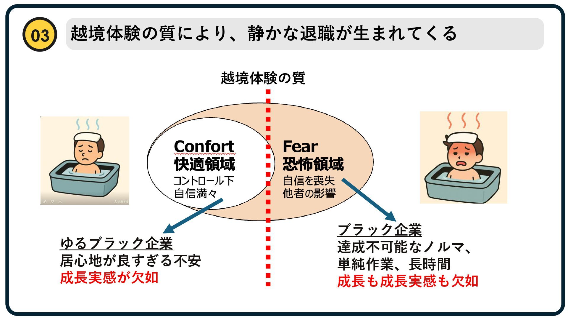 越境体験の質により、静かな退職が生まれてくる ブラック企業 達成不可能なノルマ、 単純作業、長時間 成長も成長実感も欠如 ゆるブラック企業 居心地が良すぎる不安 成長実感が欠如 越境体験の質 03