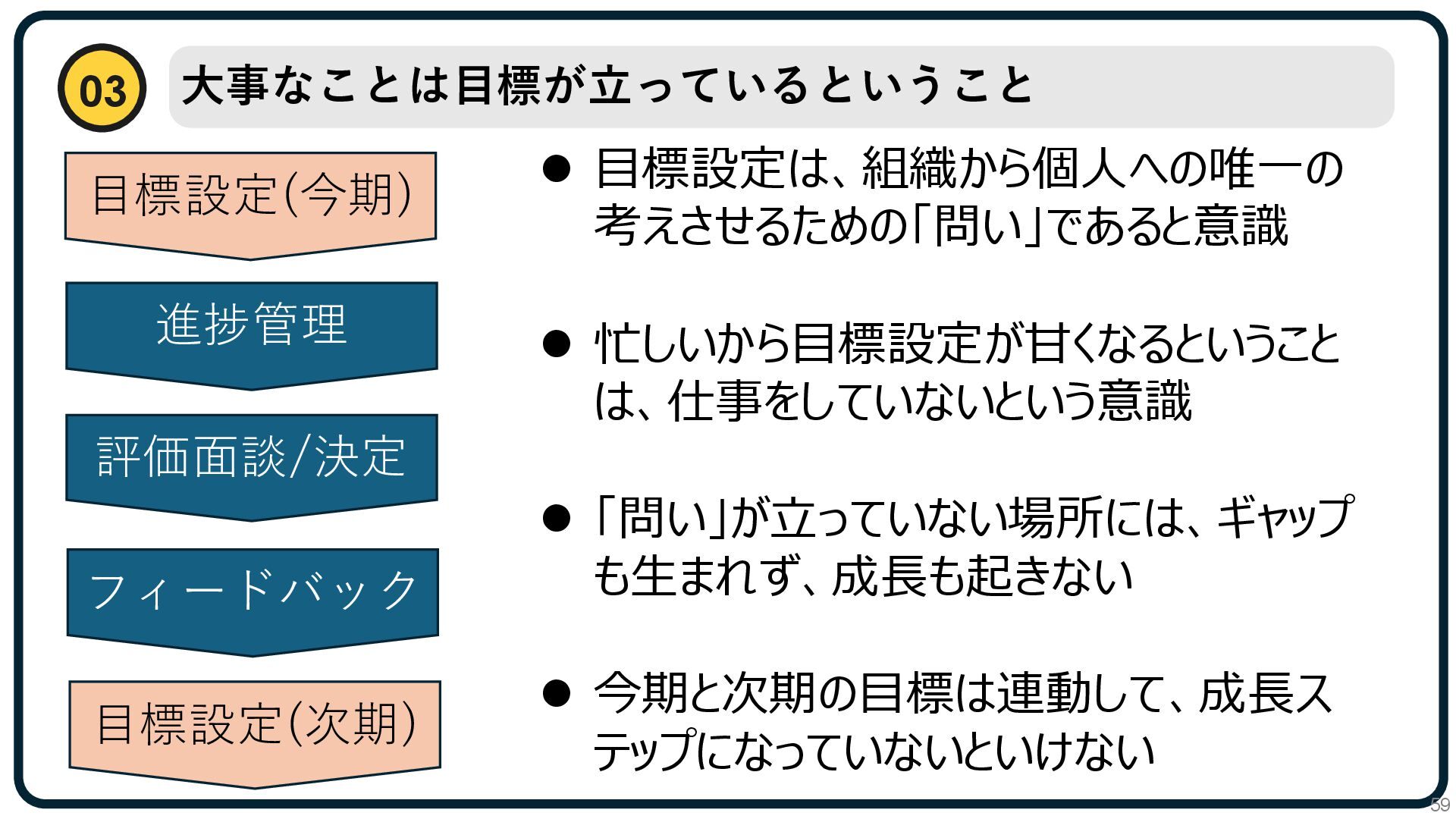 考えさせるための「問い」であると意識 ⚫ 忙しいから目標設定が甘くなるということ は、仕事をしていないという意識 ⚫ 「問い」が立っていない場所には、ギャップ も生まれず、成長も起きない ⚫ 今期と次期の目標は連動して、成長ス テップになっていないといけない