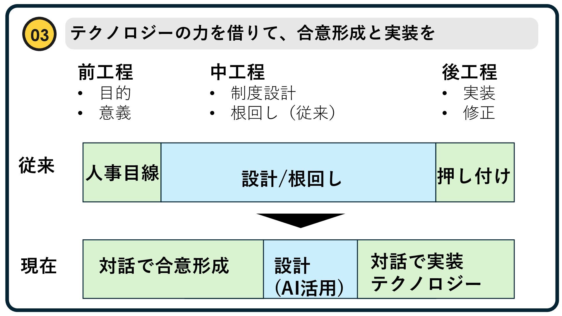 • 根回し(従来) 後工程 • 実装 • 修正 人事目線 押し付け 設計/根回し 従来 対話で合意形成 対話で実装 テクノロジー 設計 (AI活用) 現在