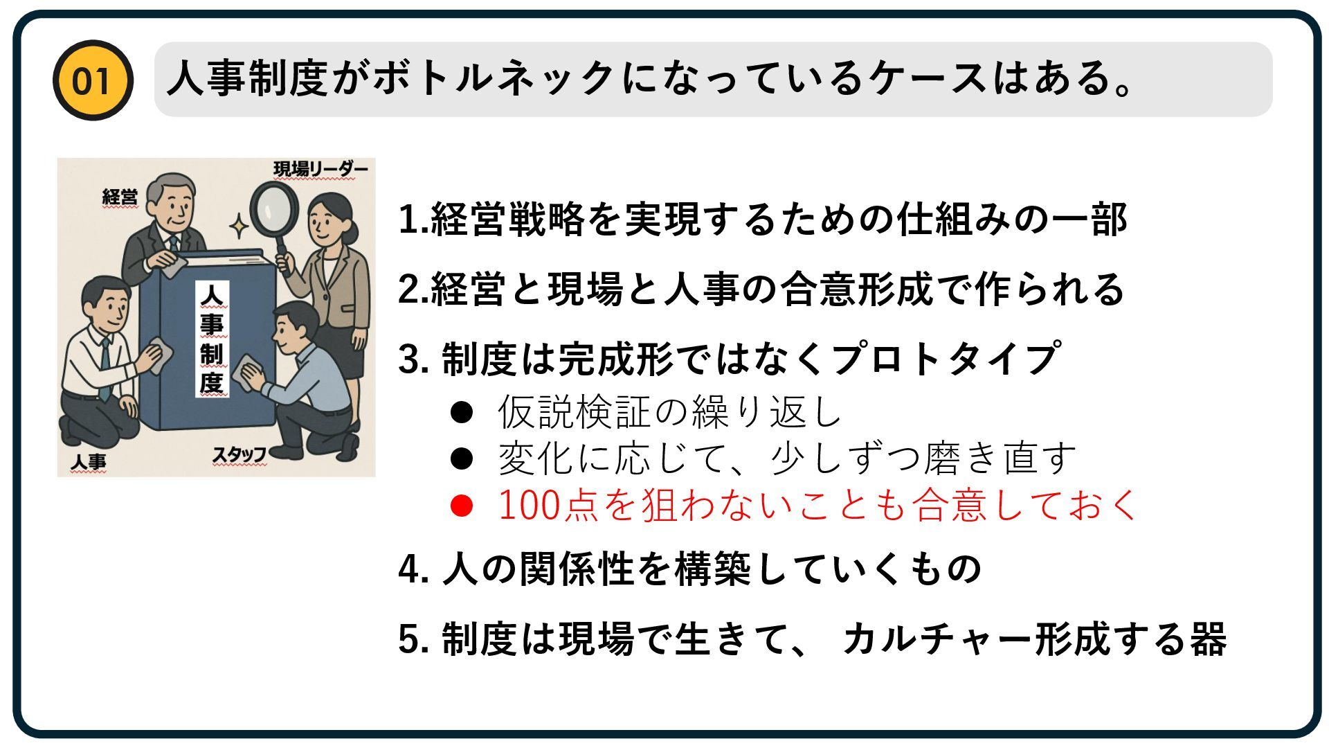 人事制度がボトルネックになっているケースはある。 01 1.経営戦略を実現するための仕組みの一部 2.経営と現場と人事の合意形成で作られる 3. 制度は完成形ではなくプロトタイプ ⚫ 仮説検証の繰り返し ⚫ 変化に応じて、少しずつ磨き直す