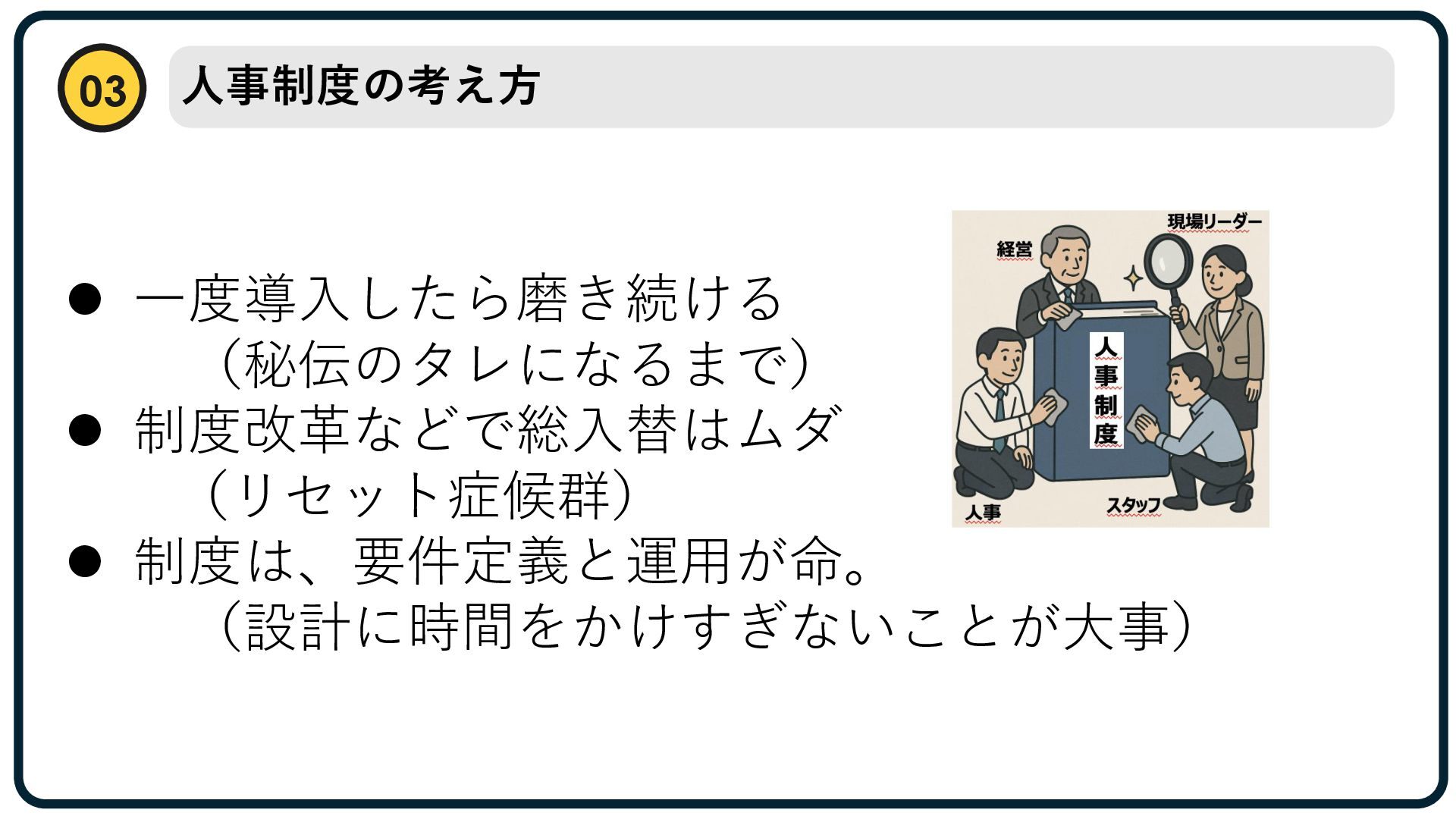 人事制度の考え方 03 ⚫ 一度導入したら磨き続ける (秘伝のタレになるまで) ⚫ 制度改革などで総入替はムダ (リセット症候群) ⚫ 制度は、要件定義と運用が命。
