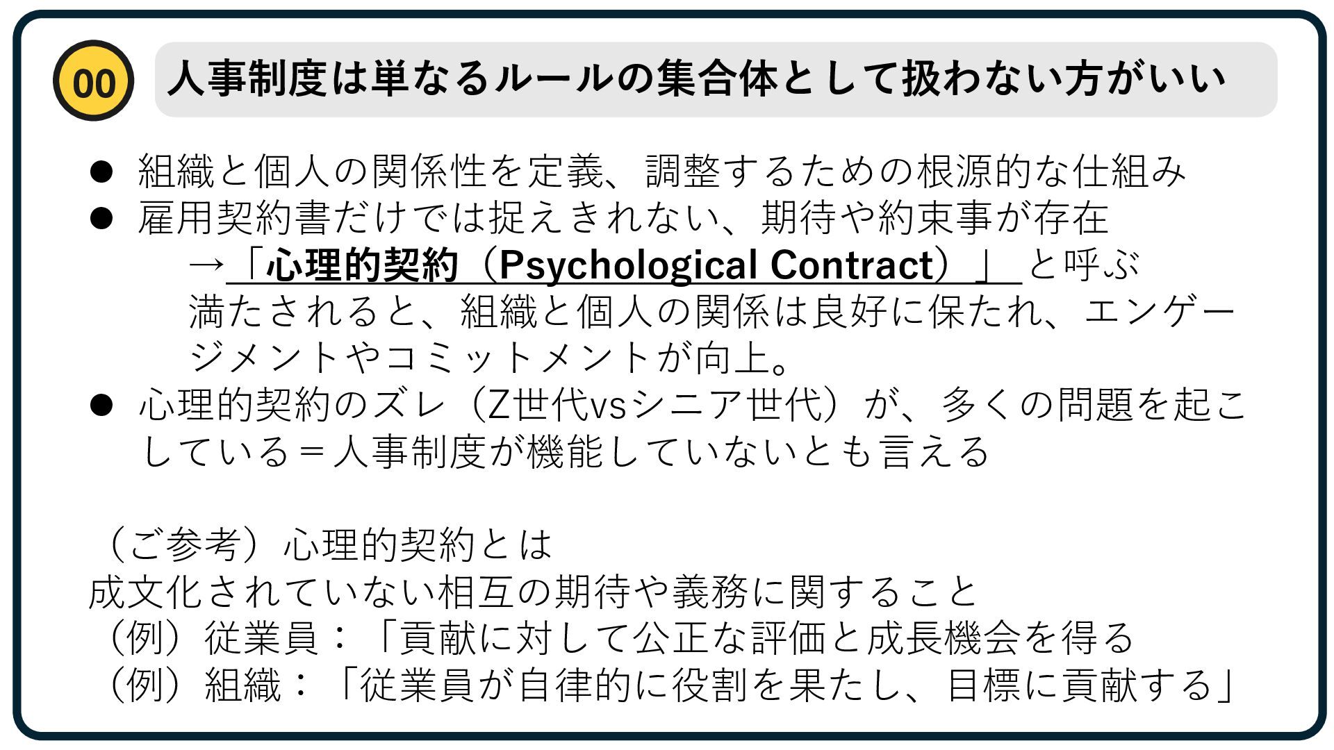 人事制度は単なるルールの集合体として扱わない方がいい 00 ⚫ 組織と個人の関係性を定義、調整するための根源的な仕組み ⚫ 雇用契約書だけでは捉えきれない、期待や約束事が存在 →「心理的契約(Psychological Contract)」 と呼ぶ 満たされると、組織と個人の関係は良好に保たれ、エンゲー