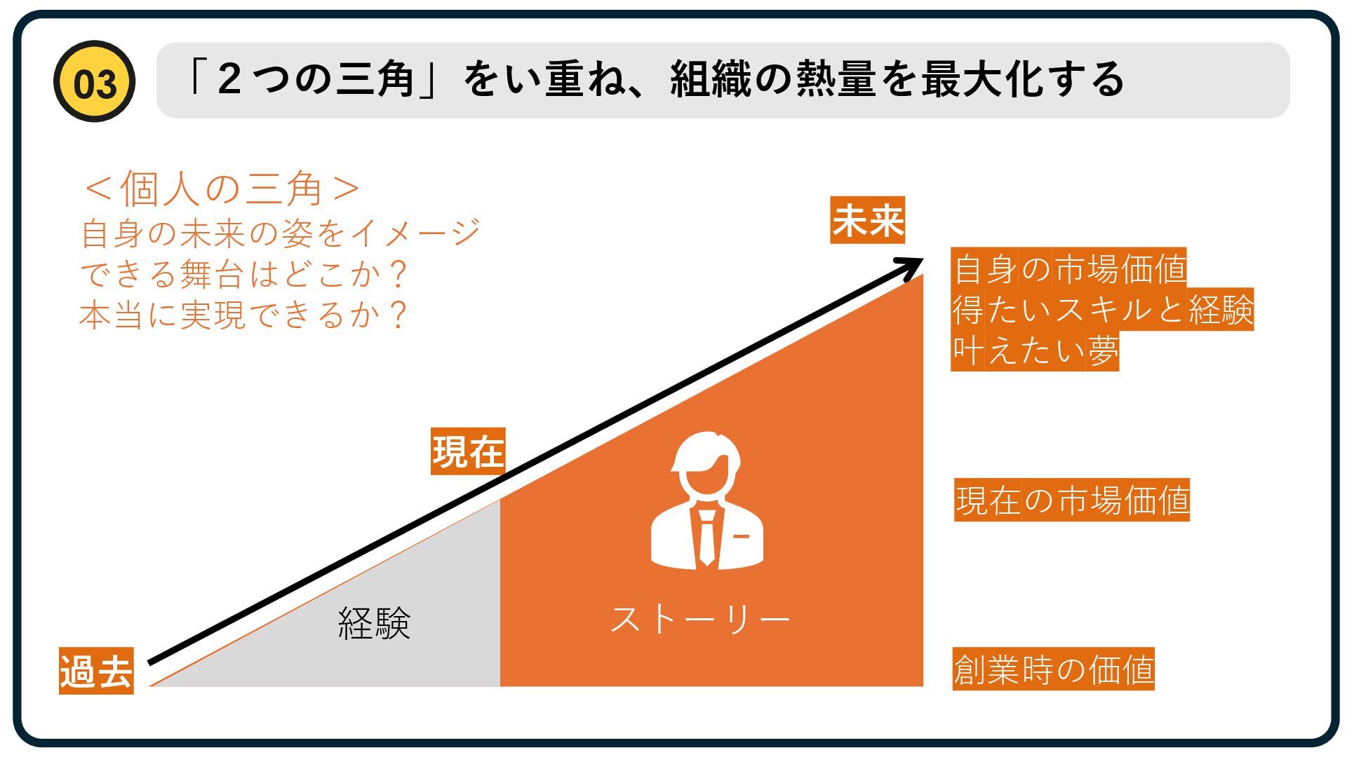 「2つの三角」をい重ね、組織の熱量を最大化する 03 現在 過去 未来 自身の市場価値 得たいスキルと経験 叶えたい夢 創業時の価値 現在の市場価値