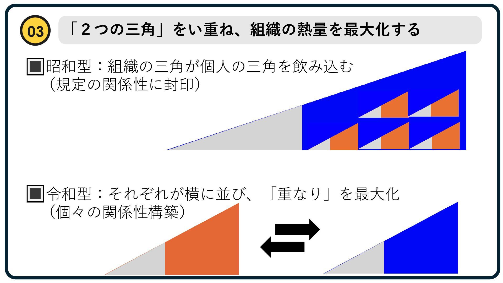 03 昭和型:組織の三角が個人の三角を飲み込む (規定の関係性に封印) 令和型:それぞれが横に並び、「重なり」を最大化 (個々の関係性構築) 「2つの三角」をい重ね、組織の熱量を最大化する