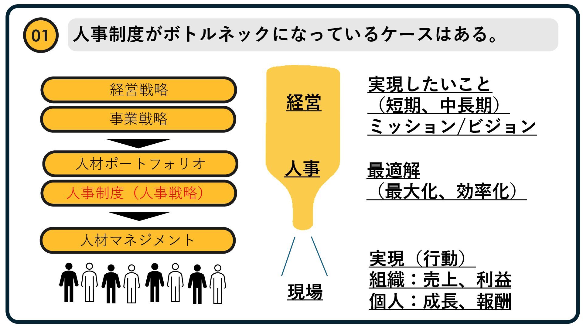 経営戦略 事業戦略 人事制度(人事戦略) 人材マネジメント 人材ポートフォリオ 人事制度がボトルネックになっているケースはある。 01 経営 人事 現場