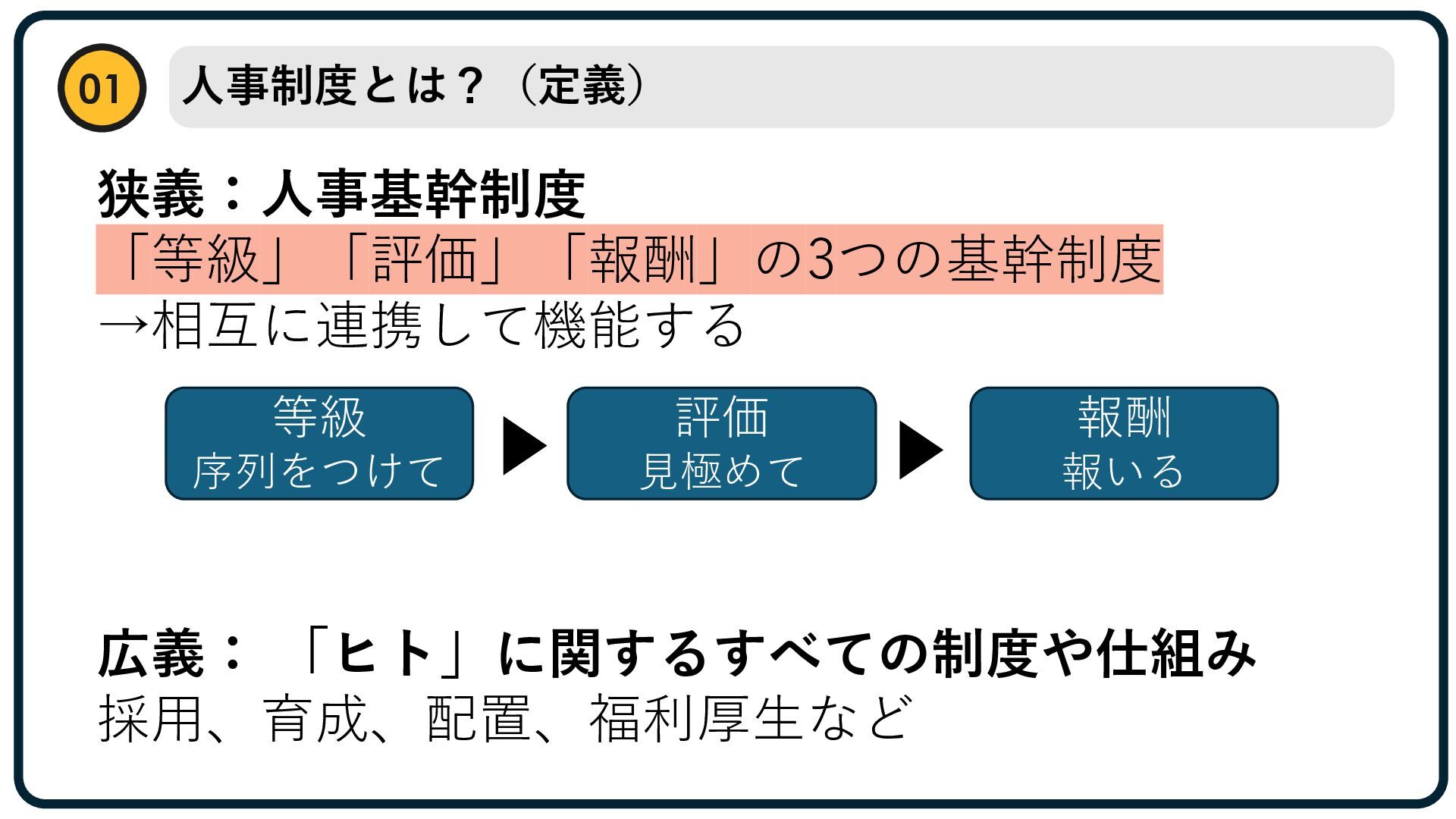 人事制度とは?(定義) 狭義:人事基幹制度 「等級」「評価」「報酬」の3つの基幹制度 →相互に連携して機能する 広義: 「ヒト」に関するすべての制度や仕組み 採用、育成、配置、福利厚生など 等級 序列をつけて 評価
