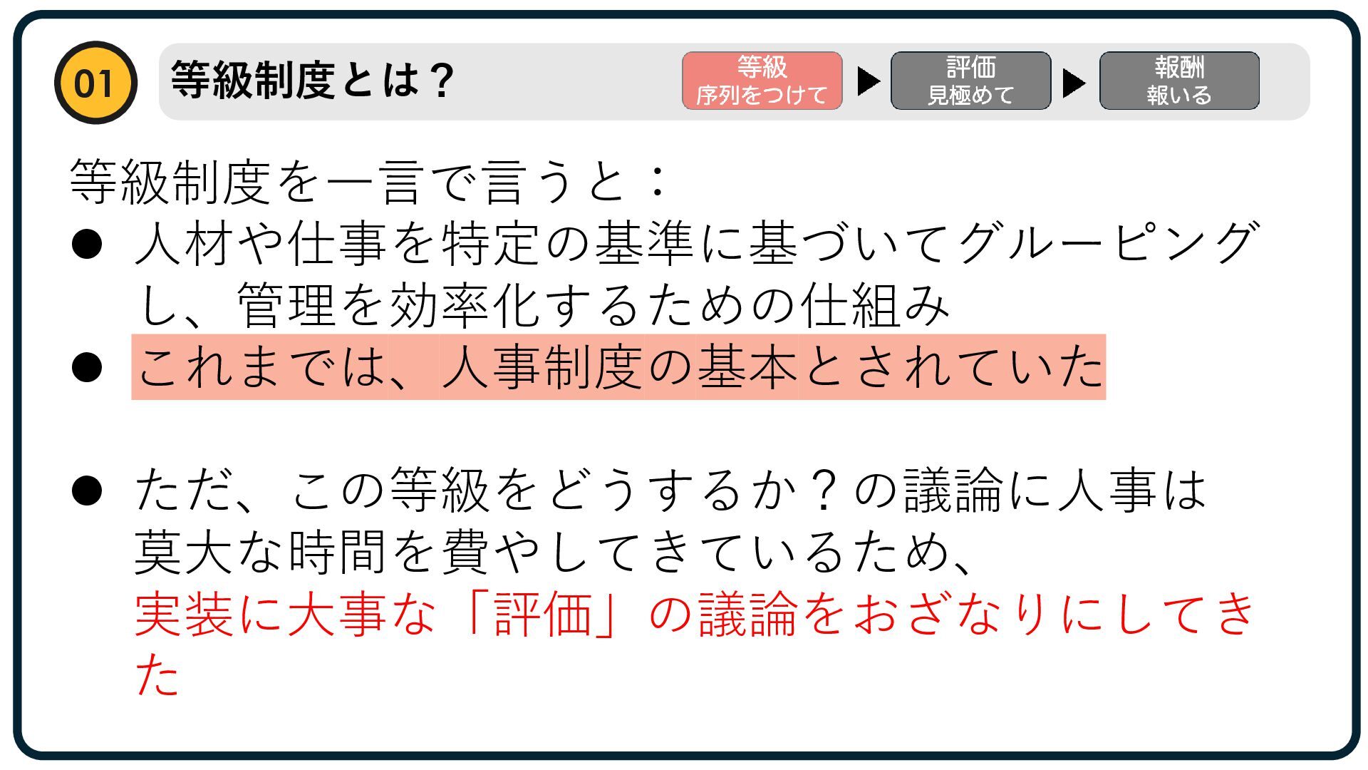 等級制度とは? 等級制度を一言で言うと: ⚫ 人材や仕事を特定の基準に基づいてグルーピング し、管理を効率化するための仕組み ⚫ これまでは、人事制度の基本とされていた ⚫ ただ、この等級をどうするか?の議論に人事は 莫大な時間を費やしてきているため、