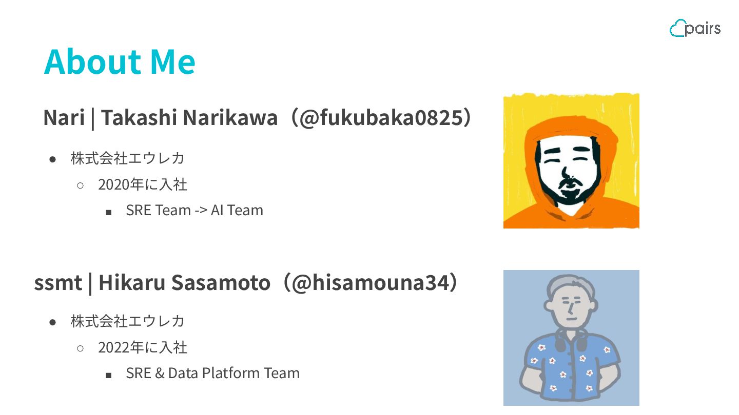 ▪ SRE Team -> AI Team ssmt | Hikaru Sasamoto(@hisamouna34) • 株式会社エウレカ ◦ 2022年に⼊社 ▪ SRE & Data Platform Team