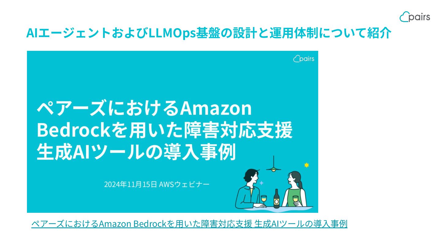 ペアーズにおけるAmazon Bedrockを⽤いた障害対応⽀援 ⽣成AIツールの導⼊事例 AIエージェントおよびLLMOps基盤の設計と運⽤体制について紹介