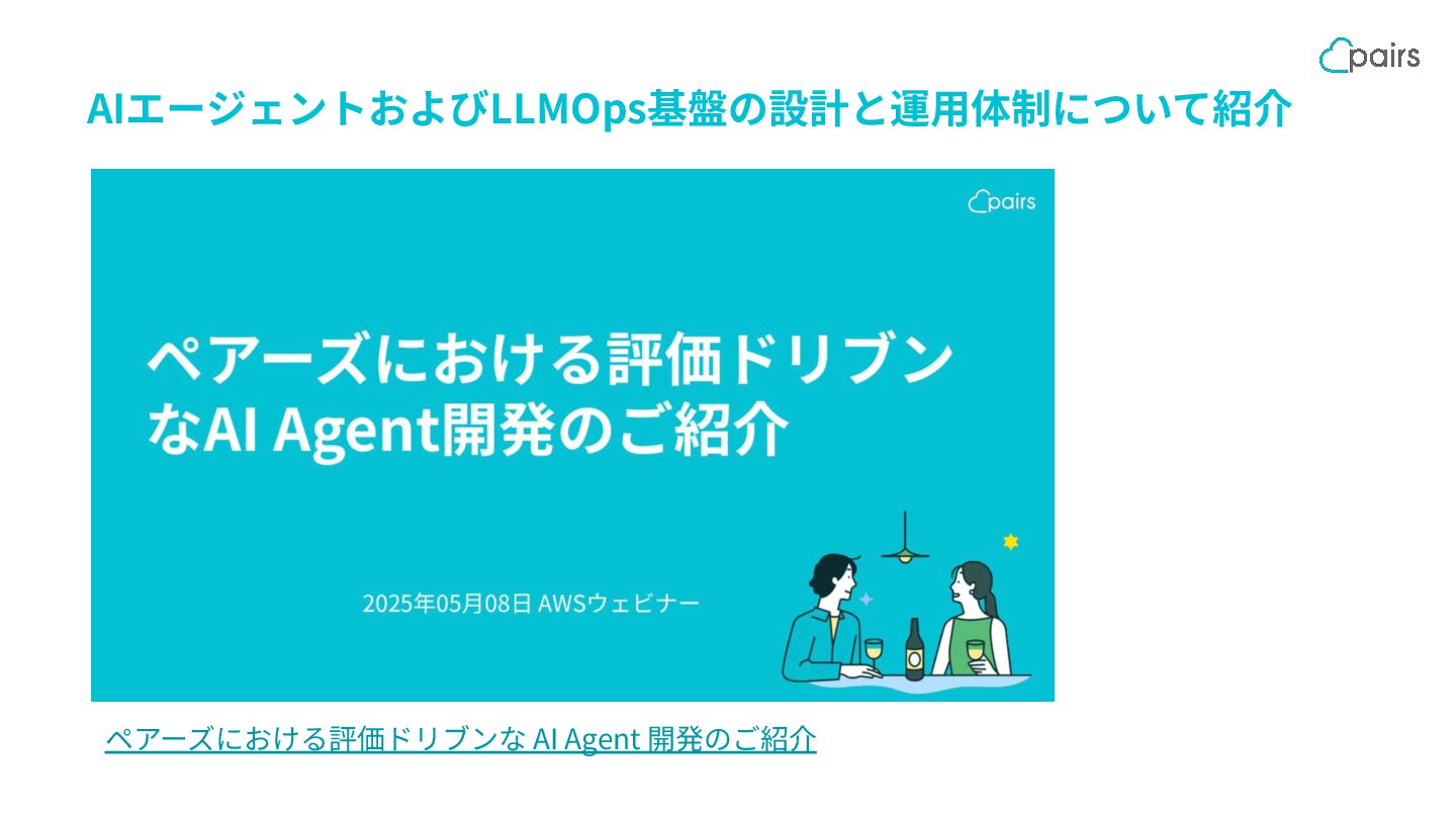 ペアーズにおける評価ドリブンな AI Agent 開発のご紹介 AIエージェントおよびLLMOps基盤の設計と運⽤体制について紹介