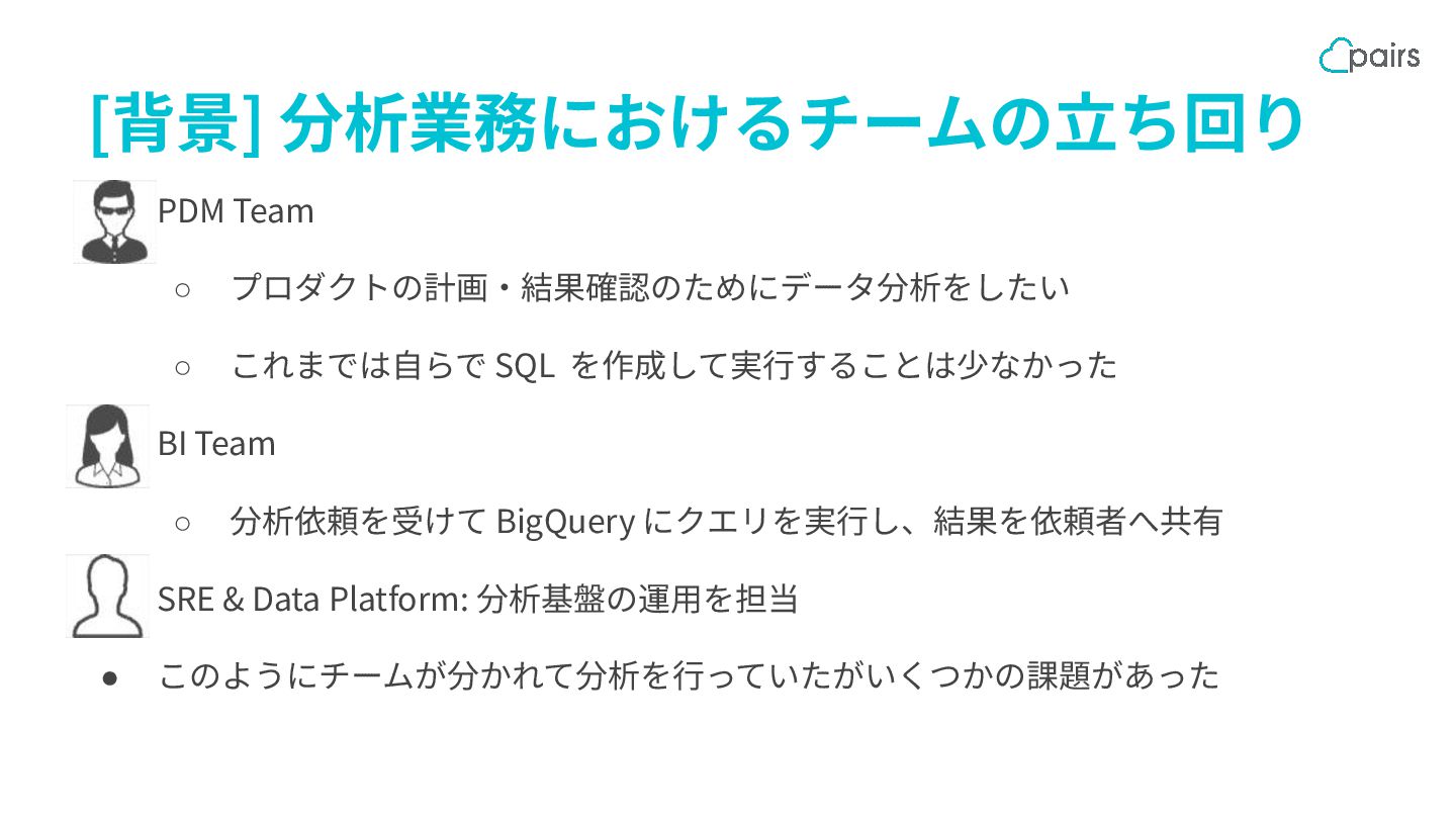 を作成して実⾏することは少なかった • BI Team ◦ 分析依頼を受けて BigQuery にクエリを実⾏し、結果を依頼者へ共有 • SRE & Data Platform: 分析基盤の運⽤を担当 • このようにチームが分かれて分析を⾏っていたがいくつかの課題があった