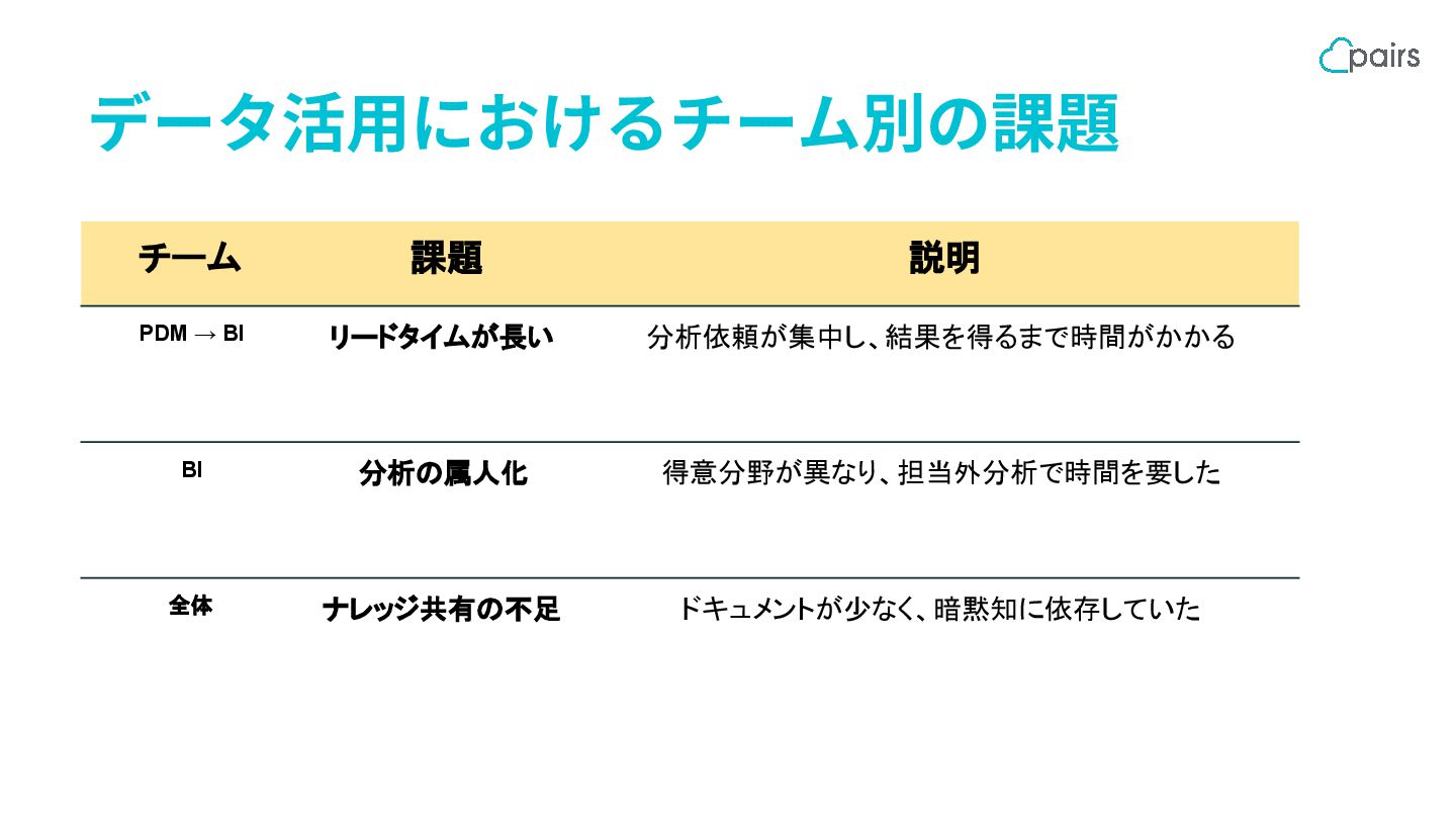 データ活⽤におけるチーム別の課題 チーム 課題 説明 PDM → BI リードタイムが長い 分析依頼が集中し、結果を得るまで時間がかかる BI