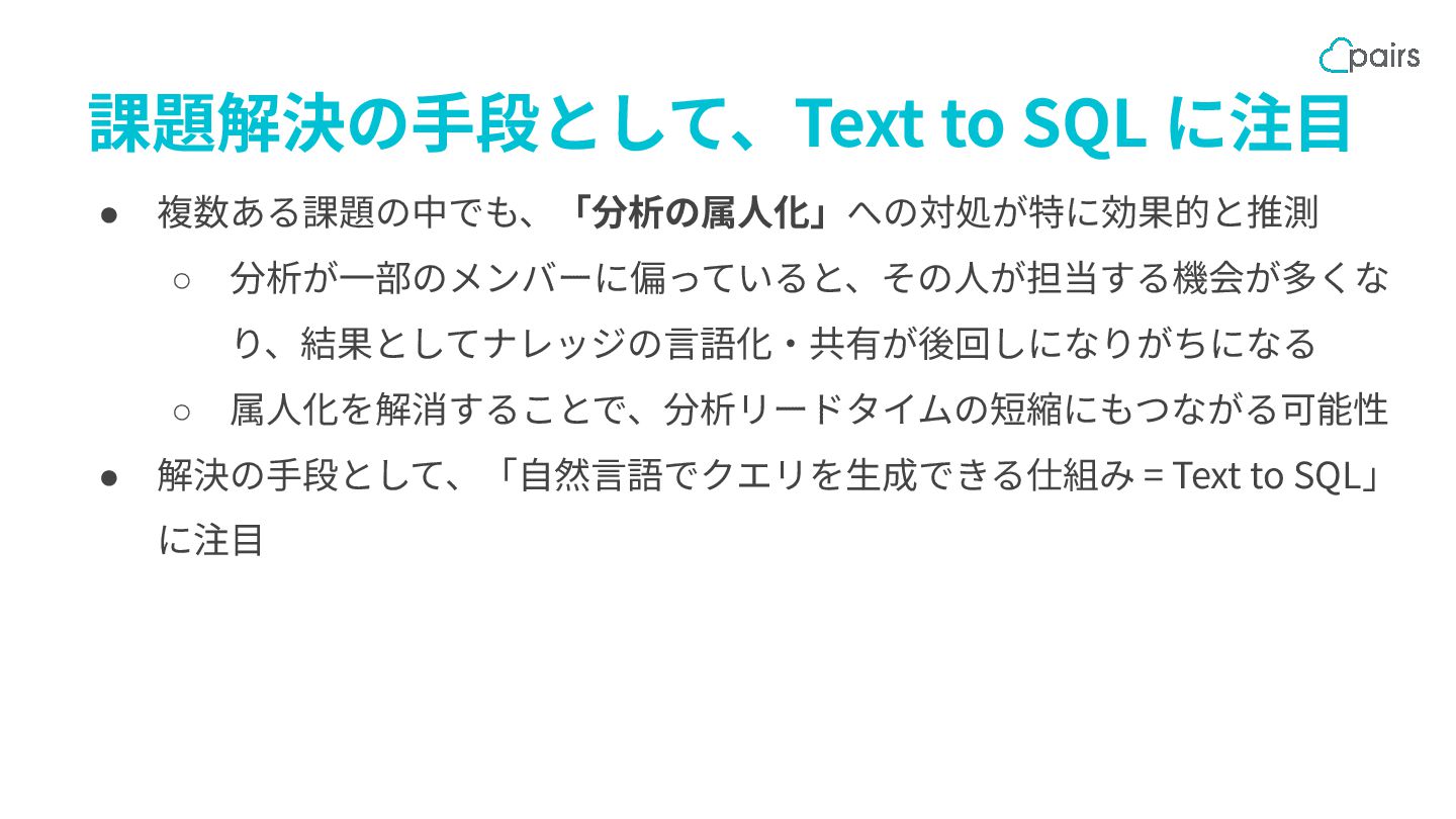 課題解決の⼿段として、Text to SQL に注⽬ • 複数ある課題の中でも、「分析の属⼈化」への対処が特に効果的と推測 ◦ 分析が⼀部のメンバーに偏っていると、その⼈が担当する機会が多くな り、結果としてナレッジの⾔語化‧共有が後回しになりがちになる ◦