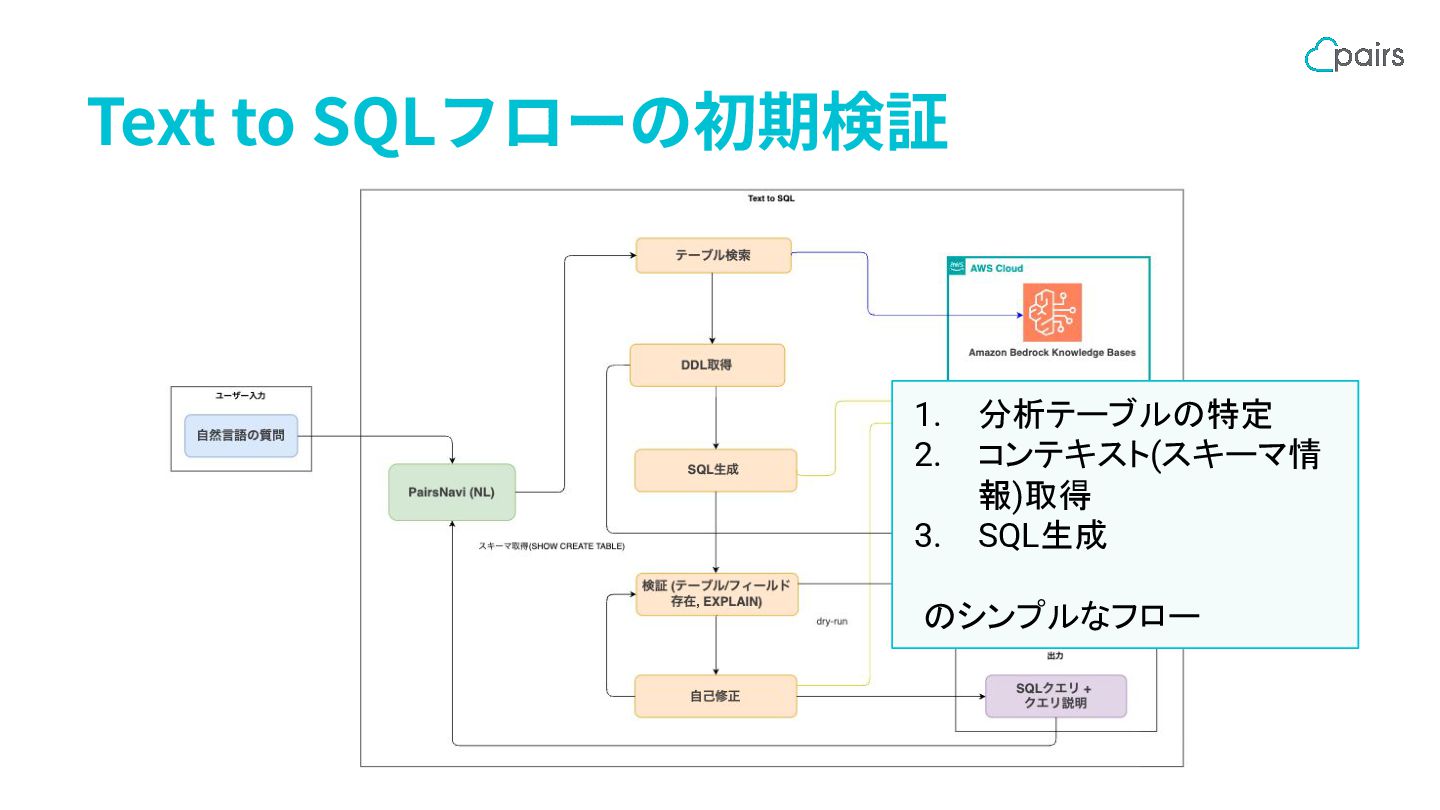 Text to SQLフローの初期検証 1. 分析テーブルの特定 2. コンテキスト(スキーマ情 報)取得 3. SQL生成