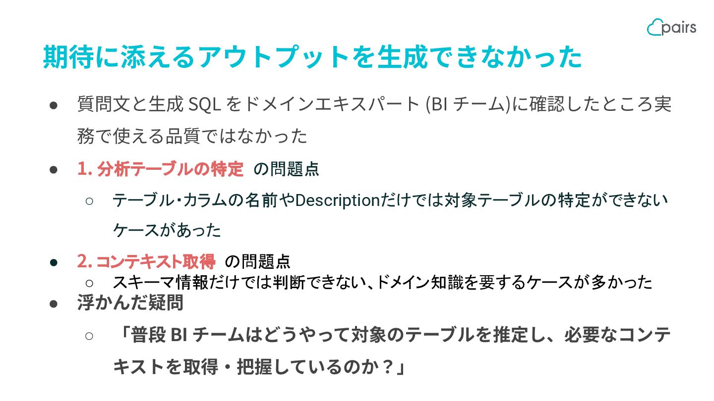 の問題点 ◦ テーブル・カラムの名前やDescriptionだけでは対象テーブルの特定ができない ケースがあった • 2. コンテキスト取得 の問題点 ◦ スキーマ情報だけでは判断できない、ドメイン知識を要するケースが多かった • 浮かんだ疑問 ◦ 「普段 BI チームはどうやって対象のテーブルを推定し、必要なコンテ キストを取得‧把握しているのか?」 期待に添えるアウトプットを⽣成できなかった