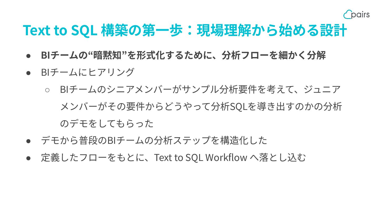 • 定義したフローをもとに、Text to SQL Workflow へ落とし込む Text to SQL 構築の第⼀歩:現場理解から始める設計