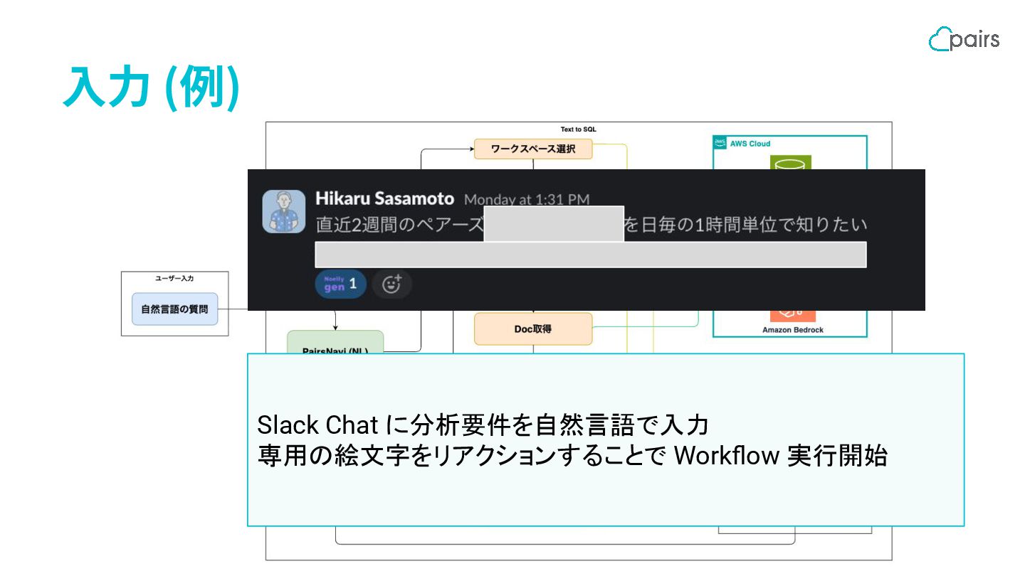 ⼊⼒ (例) Slack Chat に分析要件を自然言語で入力 専用の絵文字をリアクションすることで Workflow 実行開始