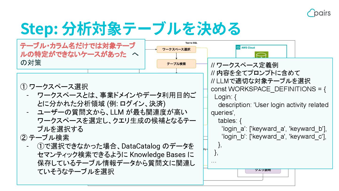ユーザーの質問文から、LLM が最も関連度が高い ワークスペースを選定し、クエリ生成の候補となるテー ブルを選択する ② テーブル検索 - ①で選択できなかった場合、DataCatalog のデータを セマンティック検索できるように Knowledge Bases に 保存しているテーブル情報データから質問文に関連し ていそうなテーブルを選択 テーブル・カラム名だけでは対象テーブ ルの特定ができないケースがあった へ の対策 // ワークスペース定義例 // 内容を全てプロンプトに含めて // LLMで適切な対象テーブルを選択 const WORKSPACE_DEFINITIONS = { Login: { description: 'User login activity related queries', tables: { 'login_a': ['keyward_a', 'keyward_b'], 'login_b': ['keyward_a', 'keyward_c'], }, }, …
