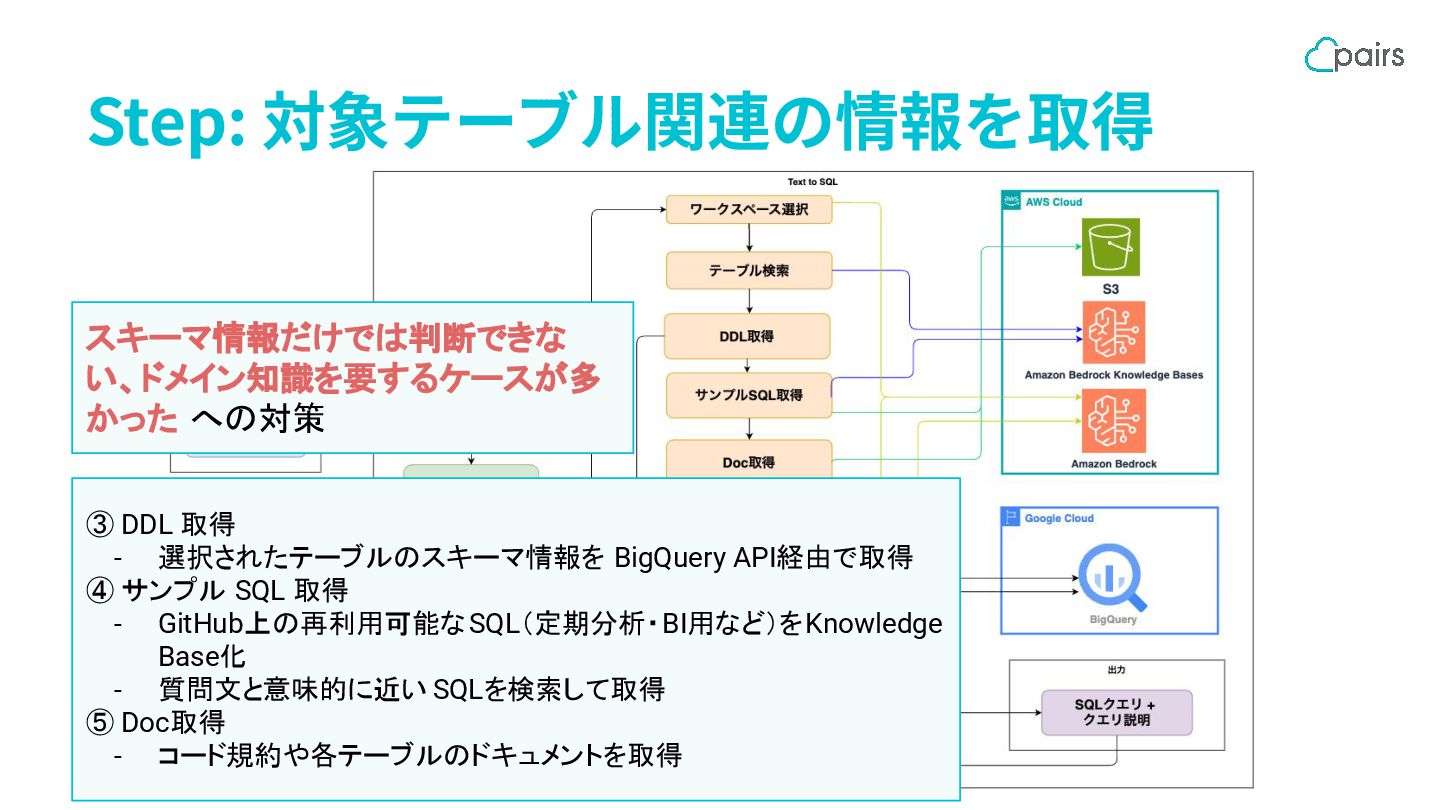 サンプル SQL 取得 - GitHub上の再利用可能なSQL(定期分析・BI用など)をKnowledge Base化 - 質問文と意味的に近い SQLを検索して取得 ⑤ Doc取得 - コード規約や各テーブルのドキュメントを取得 スキーマ情報だけでは判断できな い、ドメイン知識を要するケースが多 かった への対策