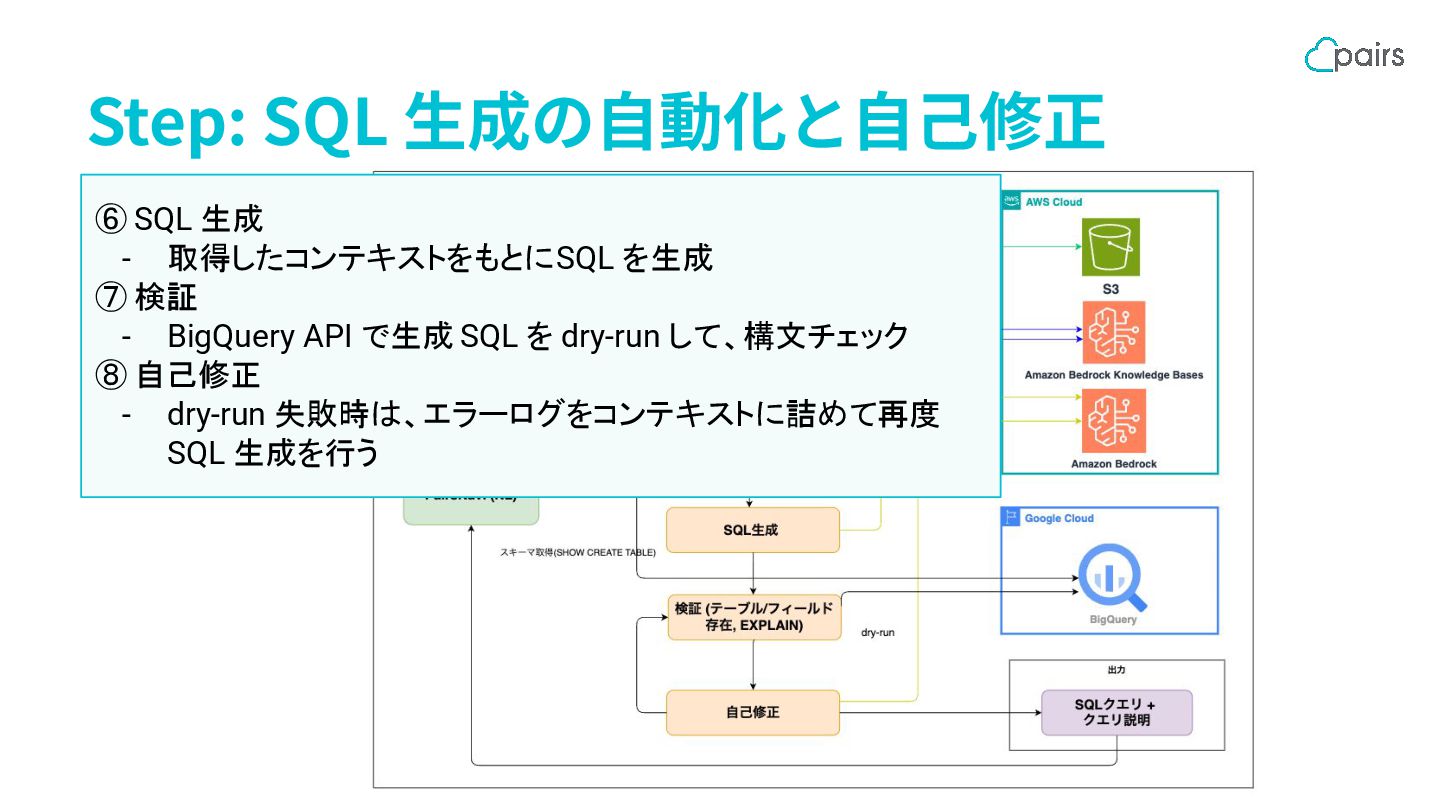 ⑦ 検証 - BigQuery API で生成 SQL を dry-run して、構文チェック ⑧ 自己修正 - dry-run 失敗時は、エラーログをコンテキストに詰めて再度 SQL 生成を行う