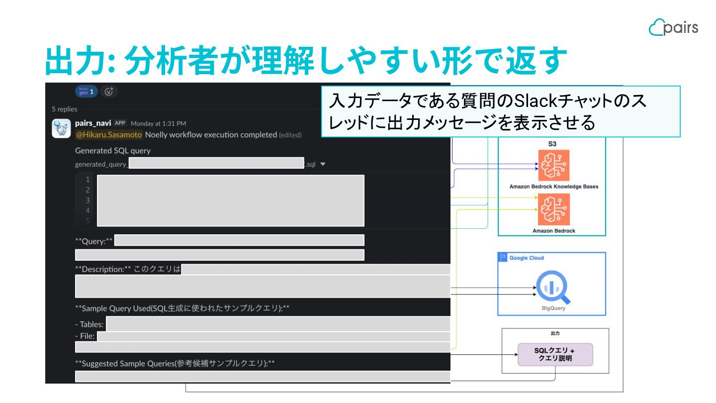 出⼒: 分析者が理解しやすい形で返す 入力データである質問のSlackチャットのス レッドに出力メッセージを表示させる