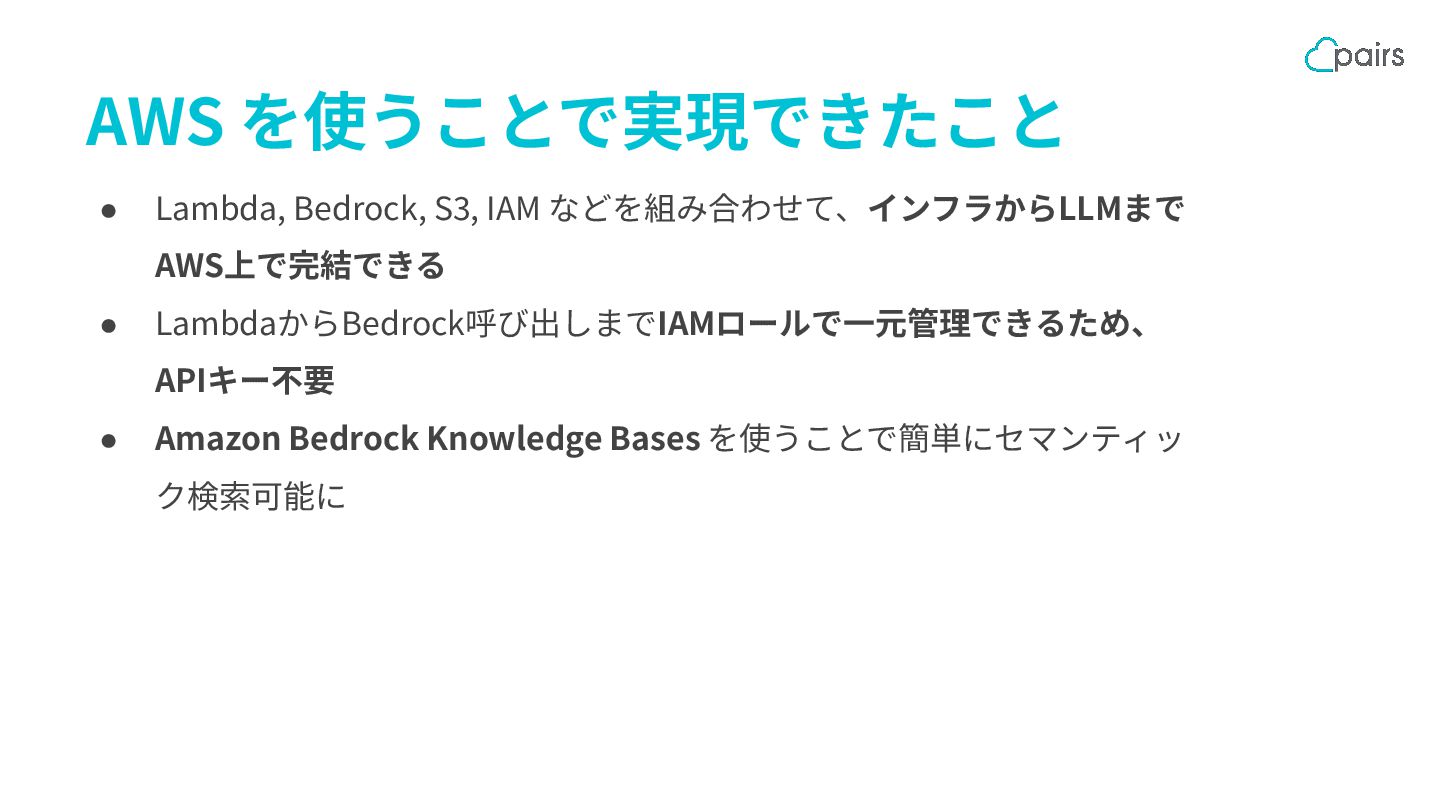 • Lambda, Bedrock, S3, IAM などを組み合わせて、インフラからLLMまで AWS上で完結できる • LambdaからBedrock呼び出しまでIAMロールで⼀元管理できるため、 APIキー不要