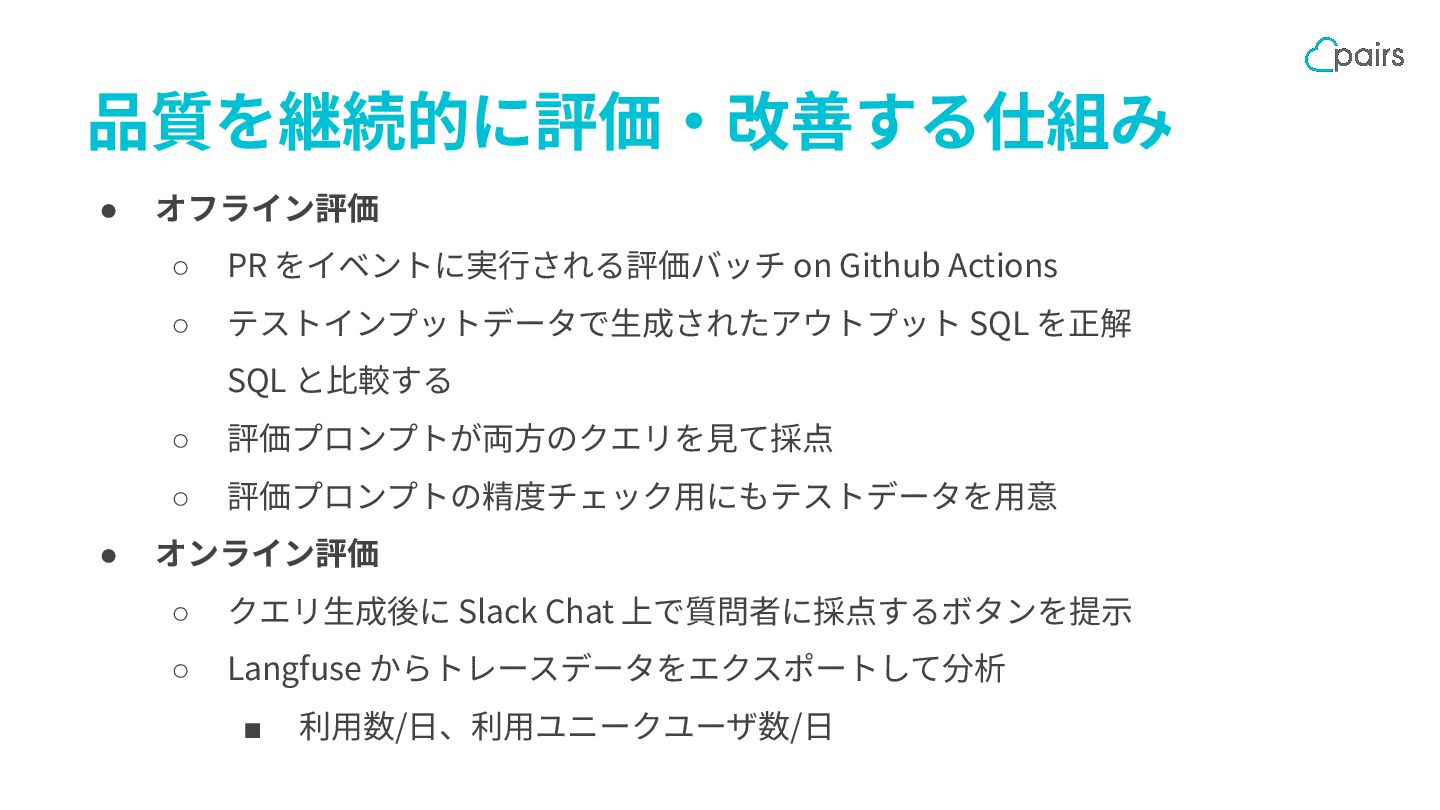 SQL を正解 SQL と⽐較する ◦ 評価プロンプトが両⽅のクエリを⾒て採点 ◦ 評価プロンプトの精度チェック⽤にもテストデータを⽤意 • オンライン評価 ◦ クエリ⽣成後に Slack Chat 上で質問者に採点するボタンを提⽰ ◦ Langfuse からトレースデータをエクスポートして分析 ▪ 利⽤数/⽇、利⽤ユニークユーザ数/⽇ 品質を継続的に評価‧改善する仕組み