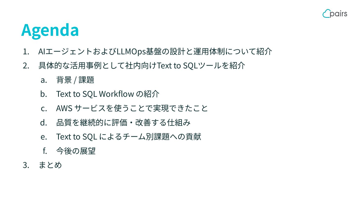 b. Text to SQL Workflow の紹介 c. AWS サービスを使うことで実現できたこと d. 品質を継続的に評価‧改善する仕組み e. Text to SQL によるチーム別課題への貢献 f. 今後の展望 3. まとめ Agenda