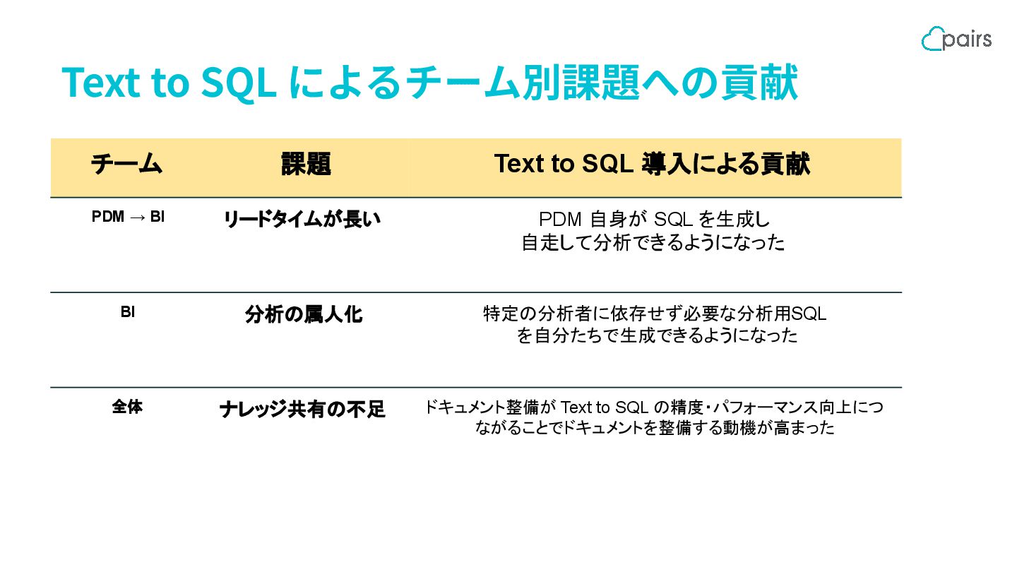 Text to SQL によるチーム別課題への貢献 チーム 課題 Text to SQL 導入による貢献