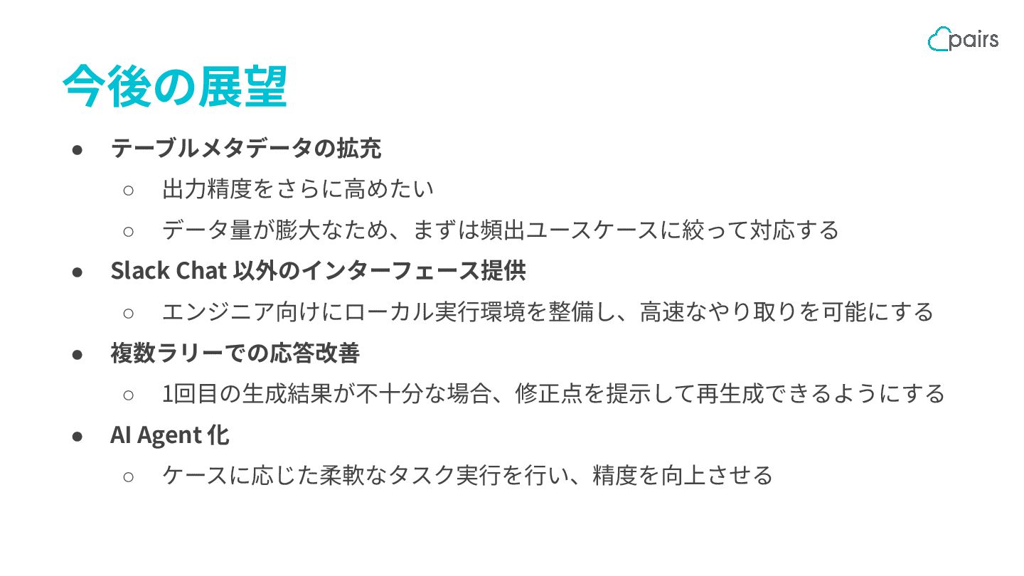 • テーブルメタデータの拡充 ◦ 出⼒精度をさらに⾼めたい ◦ データ量が膨⼤なため、まずは頻出ユースケースに絞って対応する • Slack Chat 以外のインターフェース提供