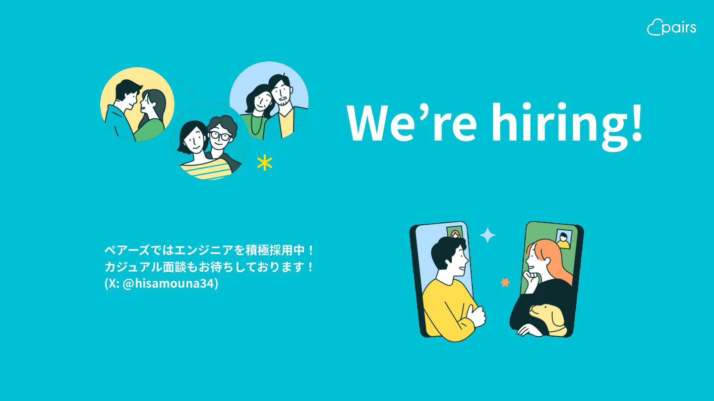 We’re hiring! ペアーズではエンジニアを積極採⽤中! カジュアル⾯談もお待ちしております! (X: @hisamouna34)