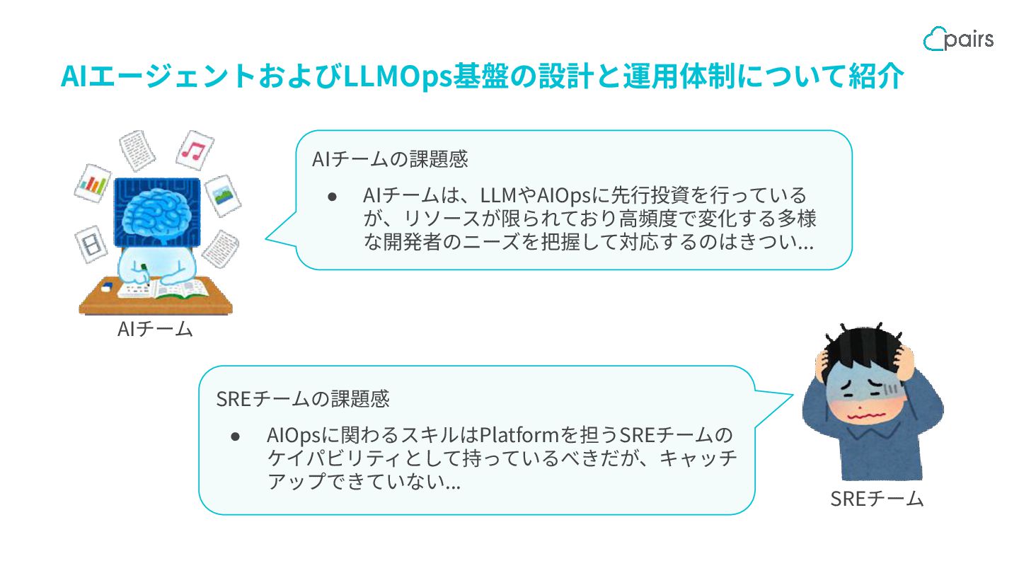 AIエージェントおよびLLMOps基盤の設計と運⽤体制について紹介 SREチームの課題感 • AIOpsに関わるスキルはPlatformを担うSREチームの ケイパビリティとして持っているべきだが、キャッチ アップできていない... AIチームの課題感 • AIチームは、LLMやAIOpsに先⾏投資を⾏っている が、リソースが限られており⾼頻度で変化する多様