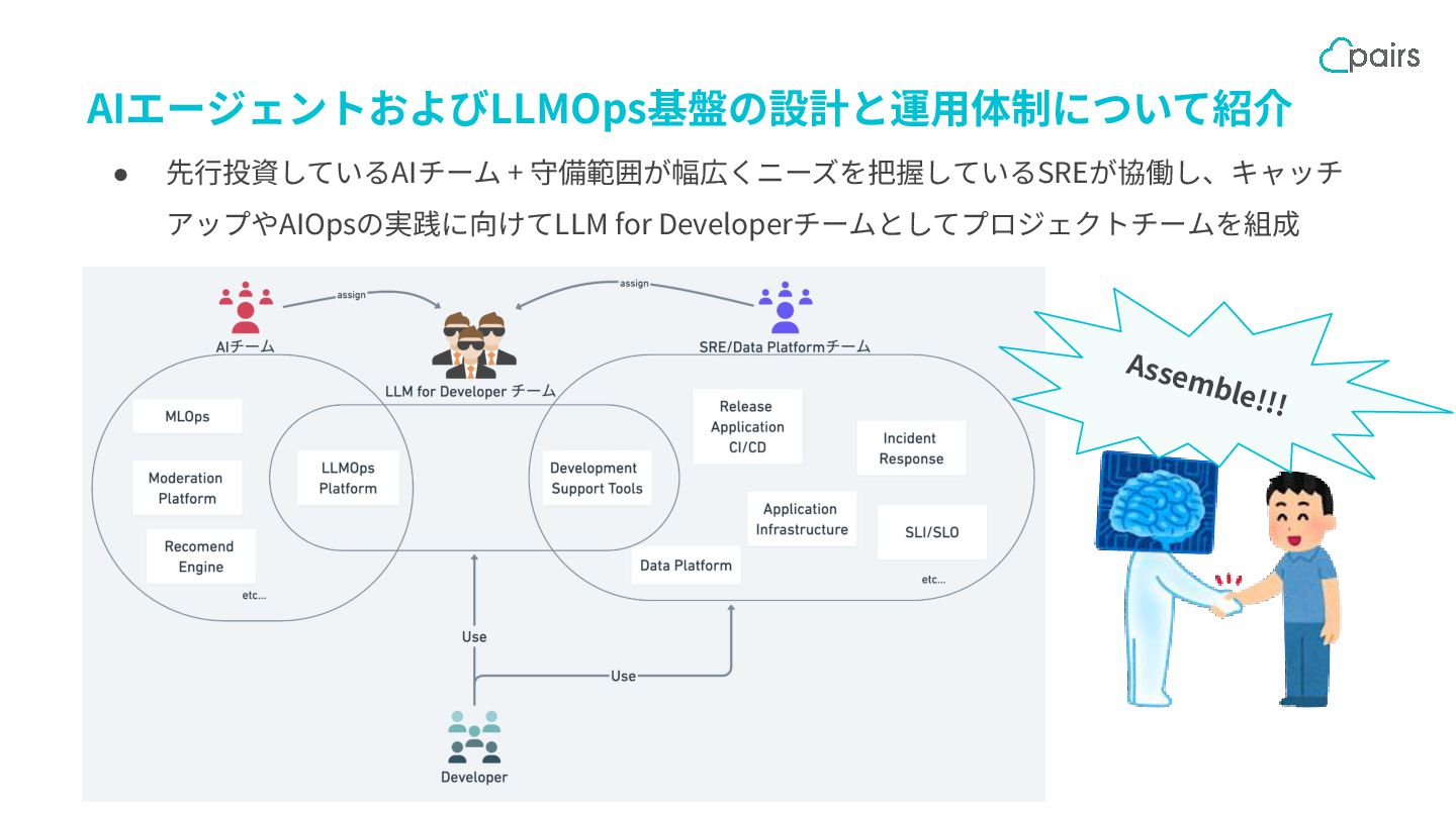 AIエージェントおよびLLMOps基盤の設計と運⽤体制について紹介 • 先⾏投資しているAIチーム + 守備範囲が幅広くニーズを把握しているSREが協働し、キャッチ アップやAIOpsの実践に向けてLLM for Developerチームとしてプロジェクトチームを組成 Assemble!!!