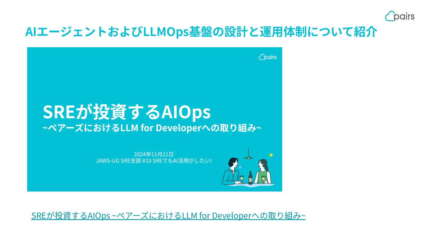 AIエージェントおよびLLMOps基盤の設計と運⽤体制について紹介 SREが投資するAIOps ~ペアーズにおけるLLM for Developerへの取り組み~