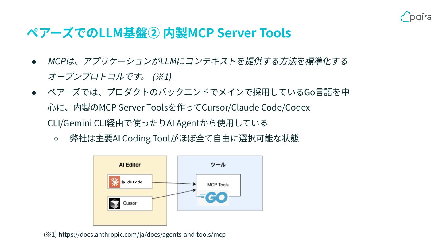 ペアーズでのLLM基盤② 内製MCP Server Tools • MCPは、アプリケーションがLLMにコンテキストを提供する⽅法を標準化する オープンプロトコルです。 • ペアーズでは、プロダクトのバックエンドでメインで採⽤しているGo⾔語を中 ⼼に、内製のMCP