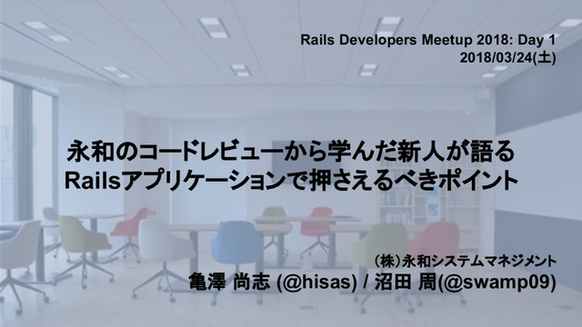 永和のコードレビューから学んだ新人が語る Railsアプリケーションで押さえるべきポイント (株)永和システムマネジメント 亀澤 尚志 (@hisas) / 沼田 周(@swamp09) Rails