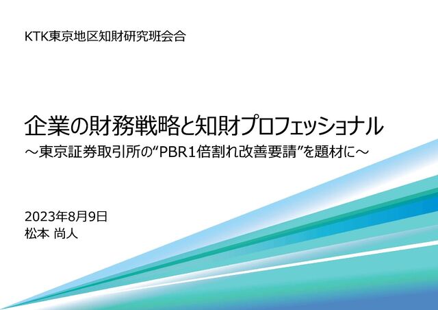 企業の財務戦略と知財プロフェッショナル ~東京証券取引所の“PBR1倍割れ改善要請”を題材に~ 企業の財務戦略と知財プロフェッショナル ~東京証券取引所の“PBR1倍割れ改善要請”を題材に~ KTK東京地区知財研究班会合 KTK東京地区知財研究班会合 2023年8月9日 松本 尚人 2023年8月9日