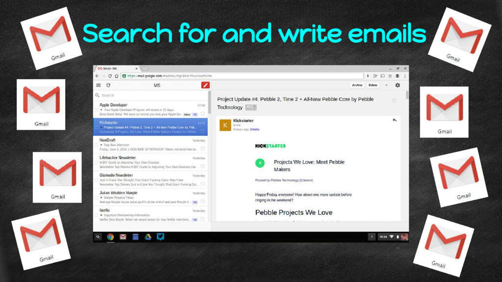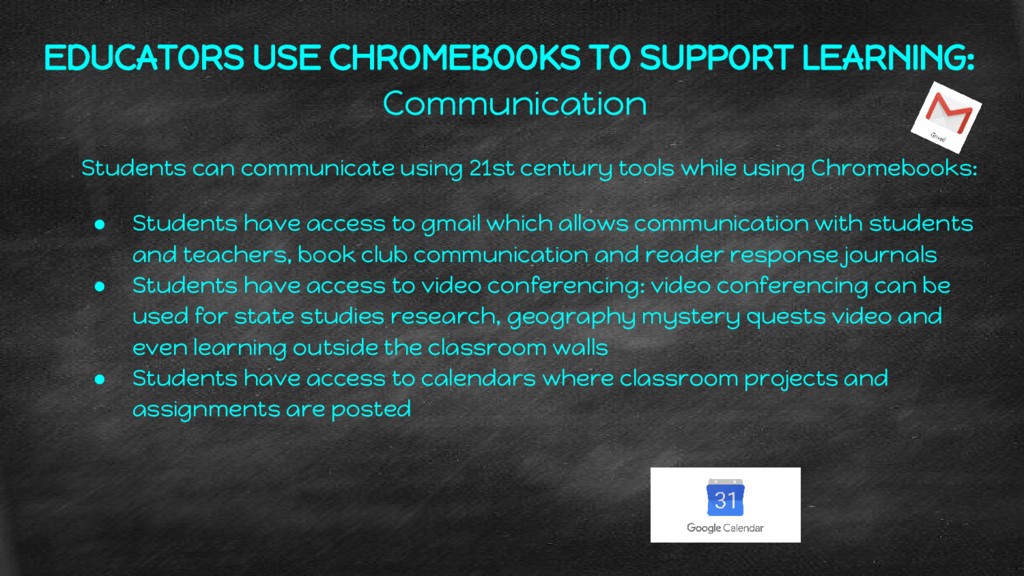 using 21st century tools while using Chromebooks: • Students have access to gmail which allows communication with students and teachers, book club communication and reader response journals • Students have access to video conferencing: video conferencing can be used for state studies research, geography mystery quests video and even learning outside the classroom walls • Students have access to calendars where classroom projects and assignments are posted