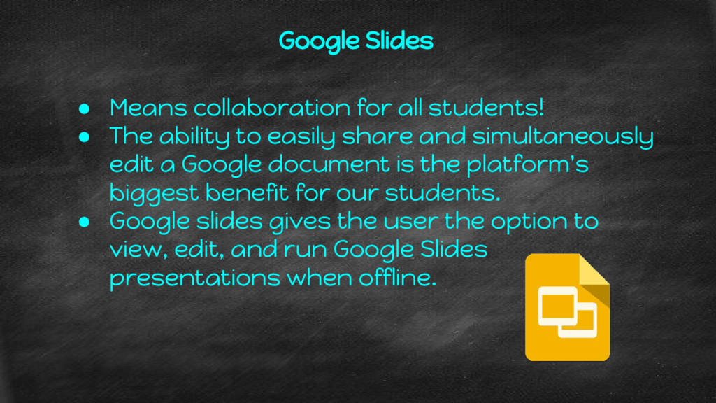 ability to easily share and simultaneously edit a Google document is the platform's biggest benefit for our students. • Google slides gives the user the option to view, edit, and run Google Slides presentations when offline.