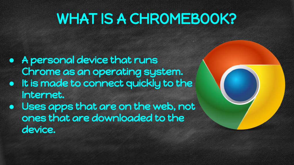 system. • It is made to connect quickly to the Internet. • Uses apps that are on the web, not ones that are downloaded to the device. WHAT IS A CHROMEBOOK?