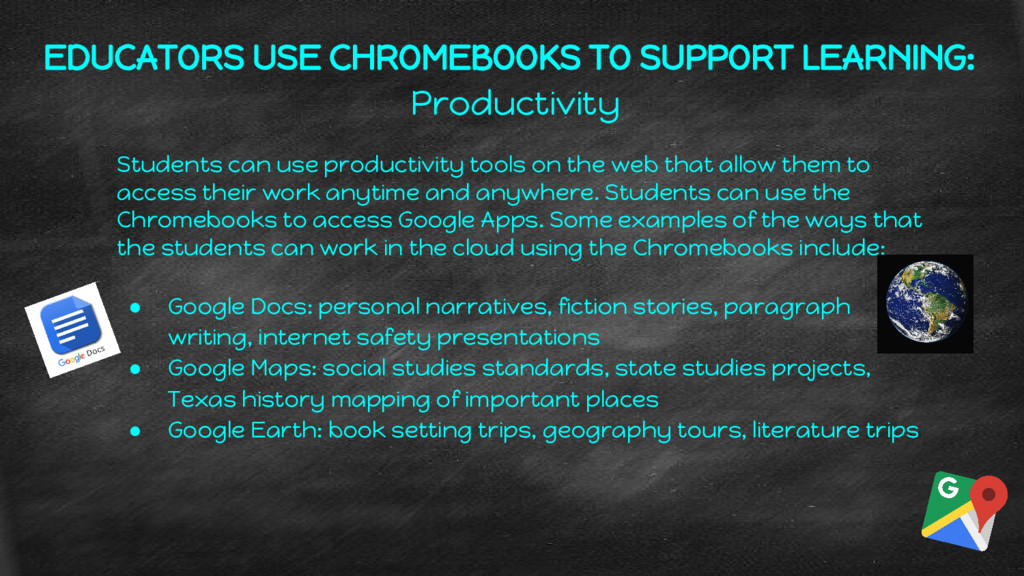 productivity tools on the web that allow them to access their work anytime and anywhere. Students can use the Chromebooks to access Google Apps. Some examples of the ways that the students can work in the cloud using the Chromebooks include: • Google Docs: personal narratives, fiction stories, paragraph writing, internet safety presentations • Google Maps: social studies standards, state studies projects, Texas history mapping of important places • Google Earth: book setting trips, geography tours, literature trips