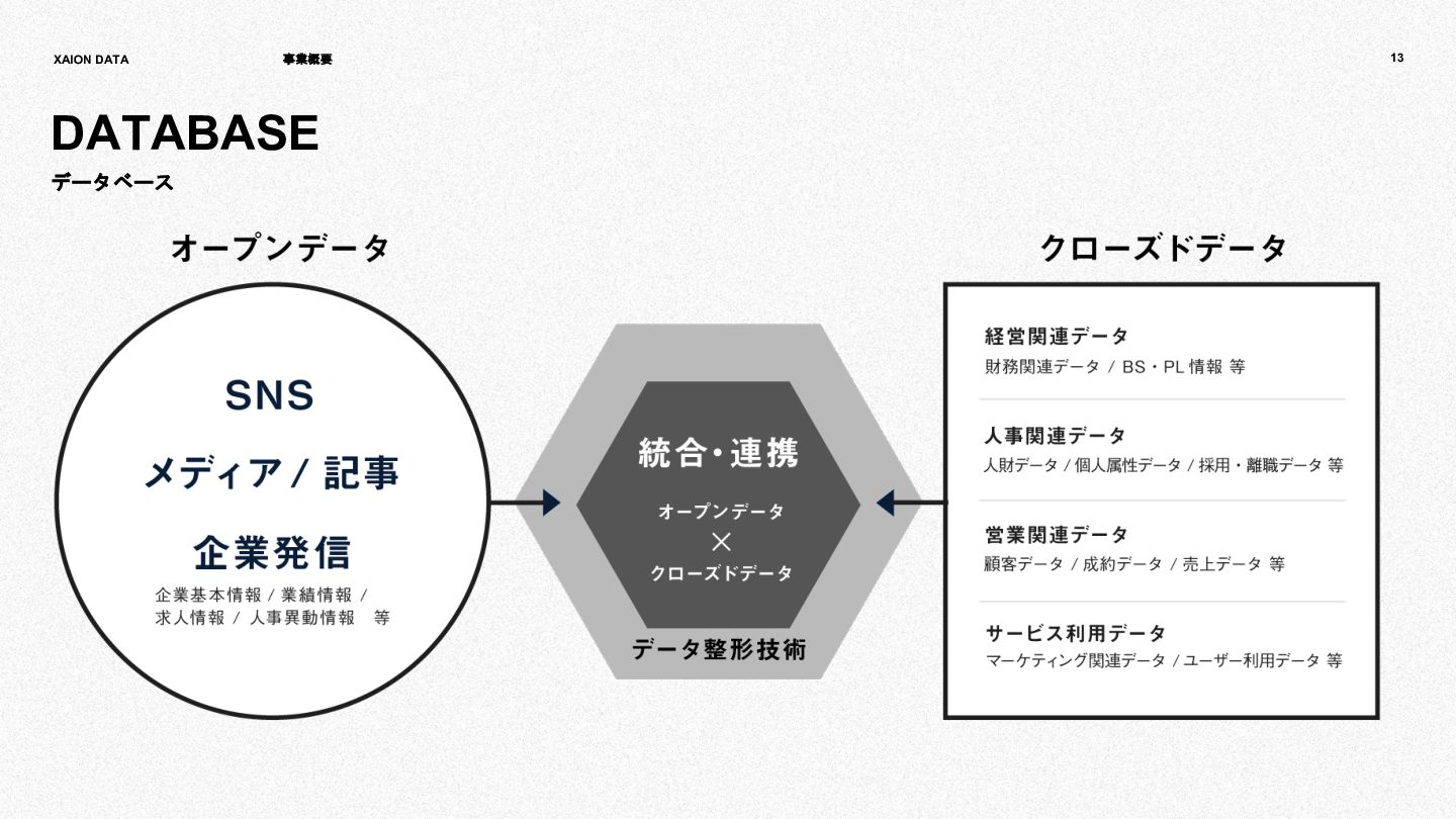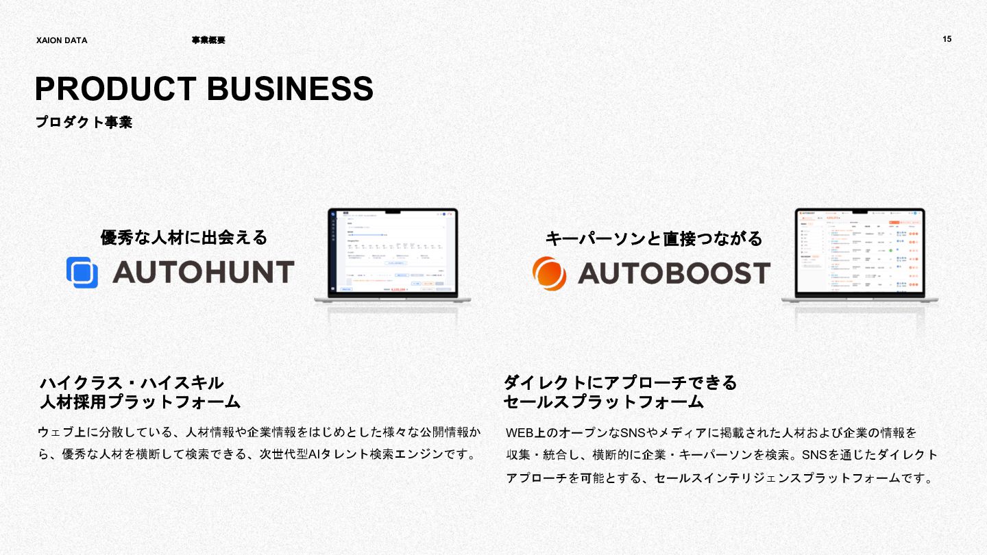 ら、優秀な人材を横断して検索できる、次世代型AIタレント検索エンジンです。 WEB上のオープンなSNSやメディアに掲載された人材および企業の情報を 収集・統合し、横断的に企業・キーパーソンを検索。SNSを通じたダイレクト アプローチを可能とする、セールスインテリジェンスプラットフォームです。 キーパーソンと直接つながる XAION DATA 事業概要