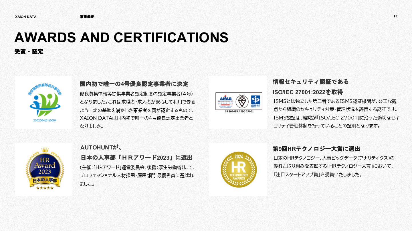 となりました。これは求職者・求人者が安心して利用できる よう一定の基準を満たした事業者を国が認定するもので、 XAION DATAは国内初で唯一の4号優良認定事業者と なりました。 AUTOHUNTが、 日本の人事部「HRアワード2023」に選出 (主催:「HRアワード」運営委員会、後援:厚生労働省)にて、 プロフェッショナル人材採用・雇用部門 最優秀賞に選ばれ ました。 情報セキュリティ認証である ISO/IEC 27001:2022を取得 ISMSとは独立した第三者であるISMS認証機関が、公正な観 点から組織のセキュリティ対策・管理状況を評価する認証です。 ISMS認証は、組織が『ISO/IEC 27001』に沿った適切なセキ ュリティ管理体制を持っていることの証明となります。 第9回HRテクノロジー大賞に選出 日本のHRテクノロジー、人事ビッグデータ(アナリティクス)の 優れた取り組みを表彰する「HRテクノロジー大賞」において、 「注目スタートアップ賞」を受賞いたしました。