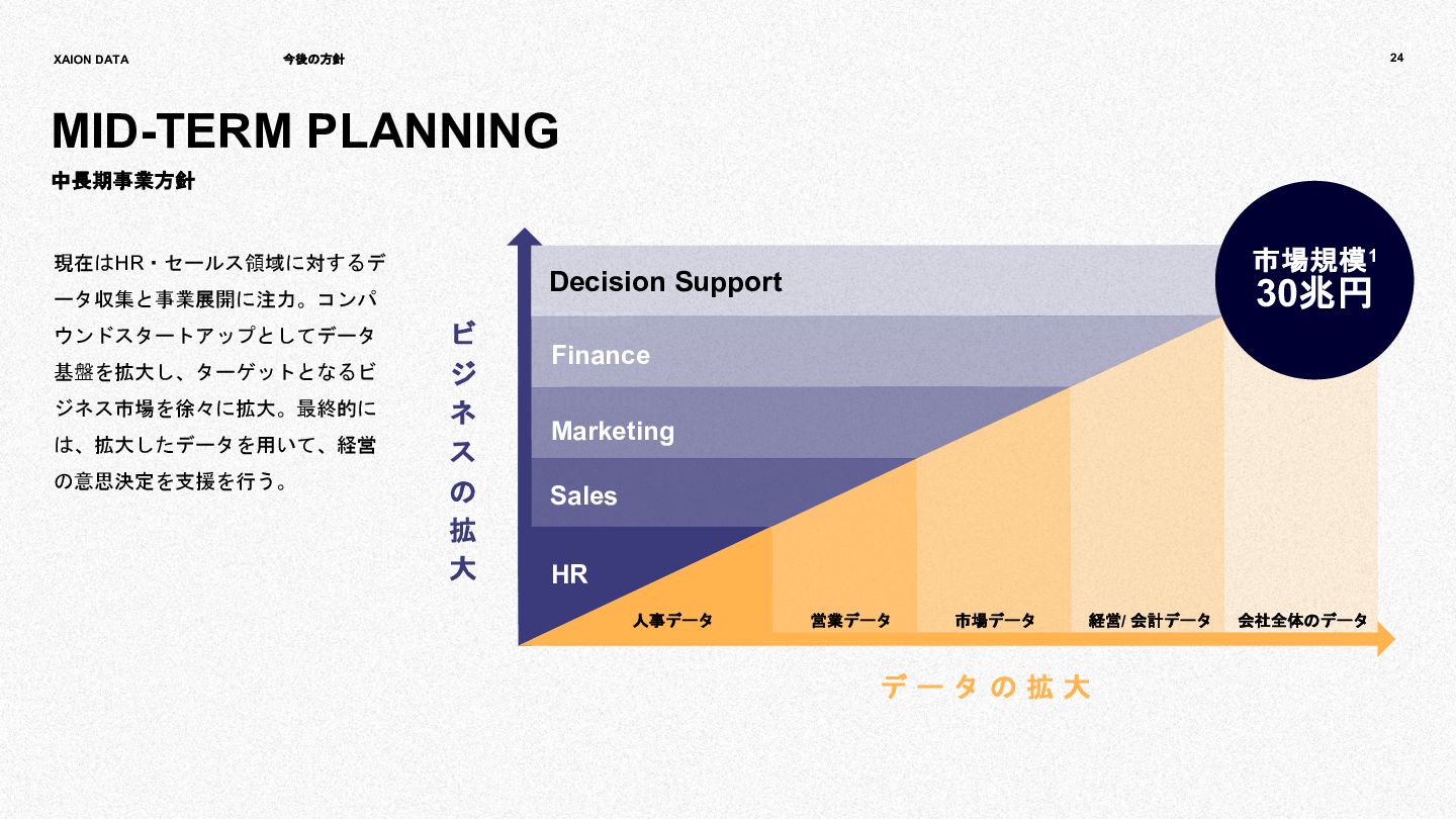 中長期事業方針 XAION DATA 今後の方針 デ ー タ の 拡 大 ビ ジ ネ ス の 拡 大 Finance Marketing HR Sales 人事データ 営業データ 市場データ 経営/ 会計データ 会社全体のデータ Finance Decision Support Marketing HR Sales 30兆円 市場規模1