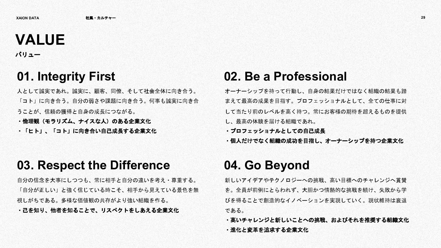 14. 29 VALUE バリュー XAION DATA 社風・カルチャー 01. Integrity First 人として誠実であれ。誠実に、顧客、同僚、そして社会全体に向き合う。