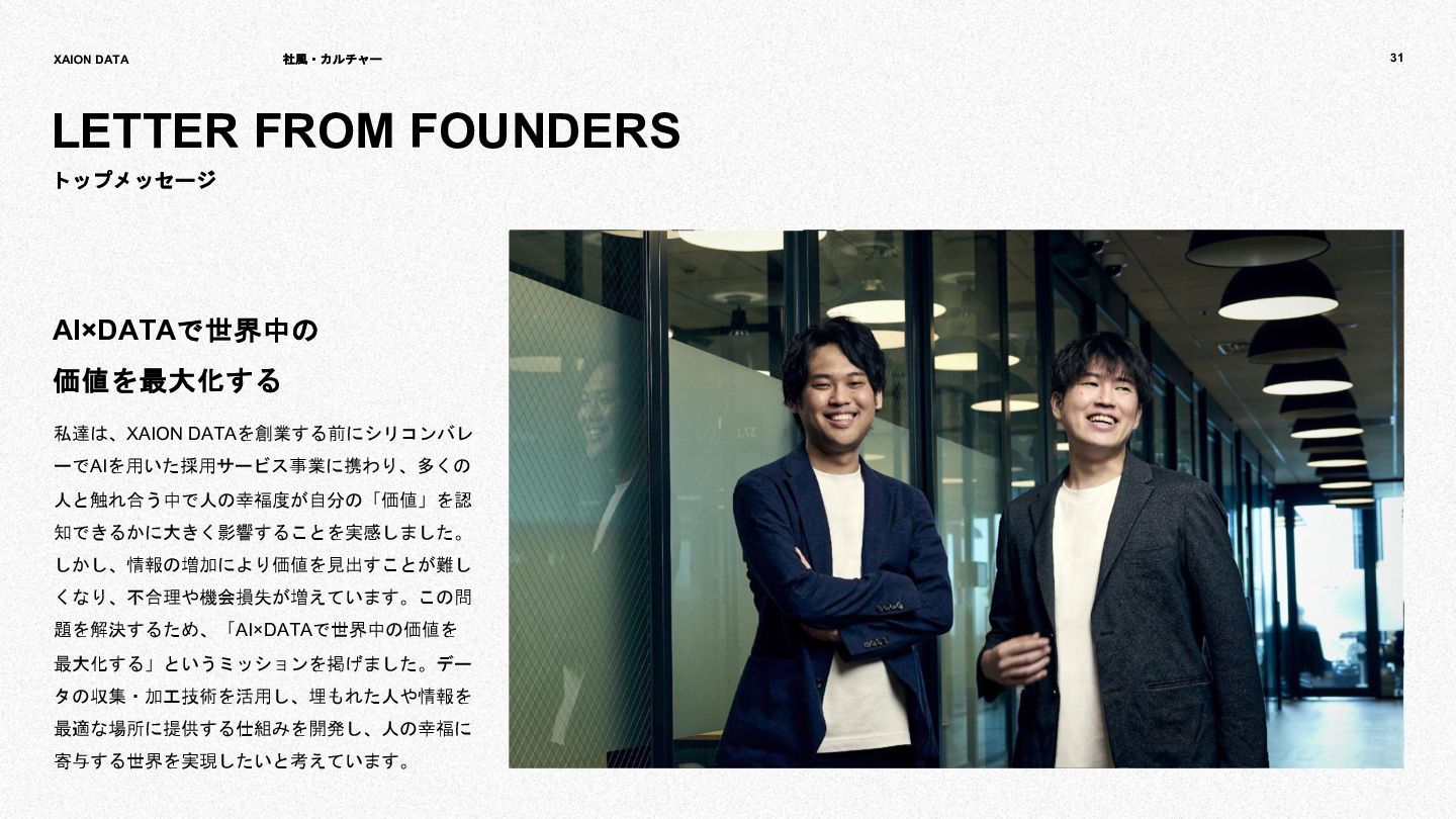 16. 31 LETTER FROM FOUNDERS トップメッセージ XAION DATA 社風・カルチャー 私達は、XAION DATAを創業する前にシリコンバレ