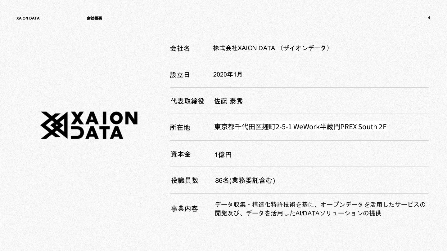DATA (ザイオンデータ) 設立日 2020年1月 所在地 東京都千代⽥区麹町2-5-1 WeWork半蔵⾨PREX South 2F 役職員数 86名(業務委託含む) 事業内容 XAION DATA 会社概要