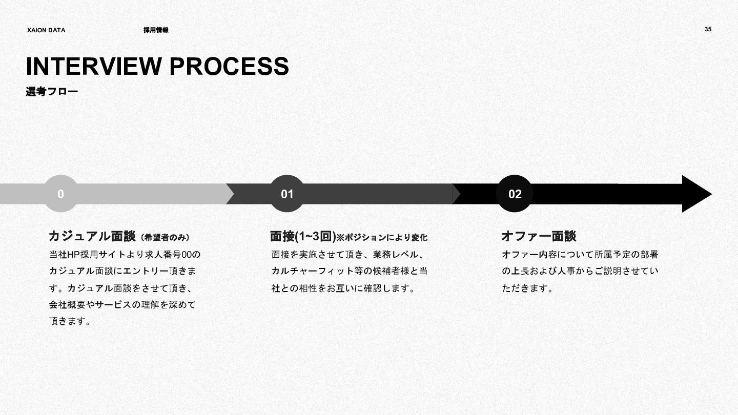 18. 35 INTERVIEW PROCESS 選考フロー XAION DATA 採用情報 カジュアル面談(希望者のみ) 当社HP採用サイトより求人番号00の カジュアル面談にエントリー頂きま
