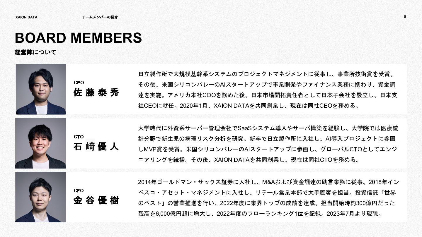DATAを共同創業し、現在は同社CEOを務める。 BOARD MEMBERS 経営陣について CFO 金 谷 優 樹 2014年ゴールドマン・サックス証券に入社し、M&Aおよび資金調達の助言業務に従事。2018年イン ベスコ・アセット・マネジメントに入社し、リテール営業本部で大手顧客を担当。投資信託「世界 のベスト」の営業推進を行い、2022年度に業界トップの成績を達成。担当開始時約300億円だった 残高を6,000億円超に増大し、2022年度のフローランキング1位を記録。2023年7月より現職。 CTO 石 﨑 優 人 大学時代に外資系サーバー管理会社でSaaSシステム導入やサーバ構築を経験し、大学院では医療統 計分野で新生児の病理リスク分析を研究。新卒で日立製作所に入社し、AI導入プロジェクトに参画 しMVP賞を受賞。米国シリコンバレーのAIスタートアップに参画し、グローバルCTOとしてエンジ ニアリングを統括。その後、XAION DATAを共同創業し、現在は同社CTOを務める。 XAION DATA チームメンバーの紹介