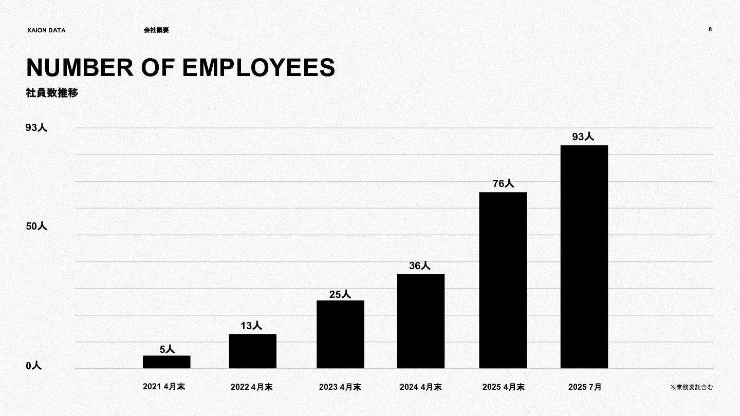 5. 8 NUMBER OF EMPLOYEES 社員数推移 XAION DATA 会社概要 93人 0人
